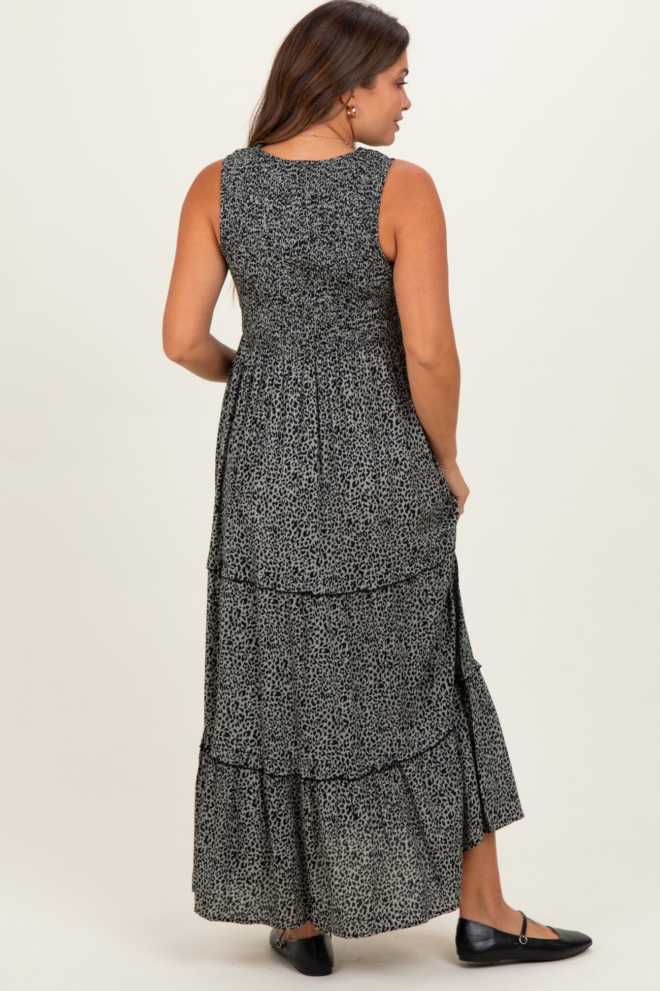 Grey Animal Print Sleeveless Smocked Tiered Maternity Maxi Dress