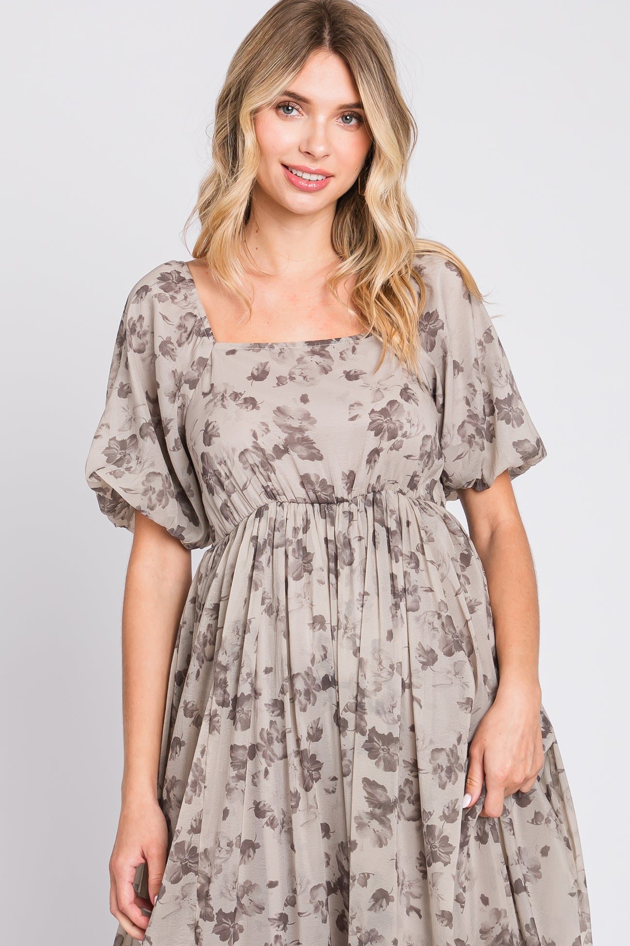 Grey Floral Square Neck Short Puff Sleeve Maxi Dress