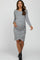 A heathered fitted maternity dress featuring ruched sides, long sleeves, a tulip hem, and a rounded neckline.