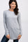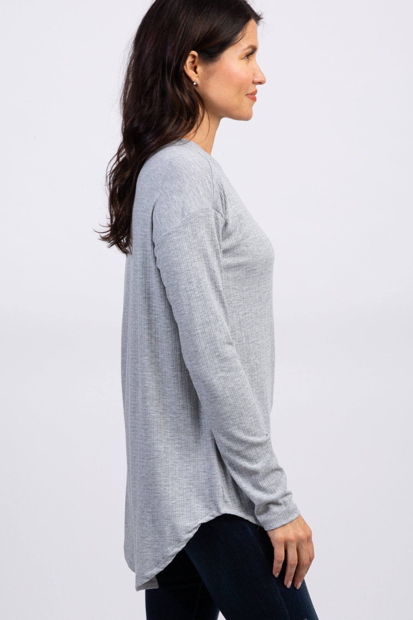 A solid hued top featuring a ribbed texture, long sleeves, a curved hem, and a rounded neckline.