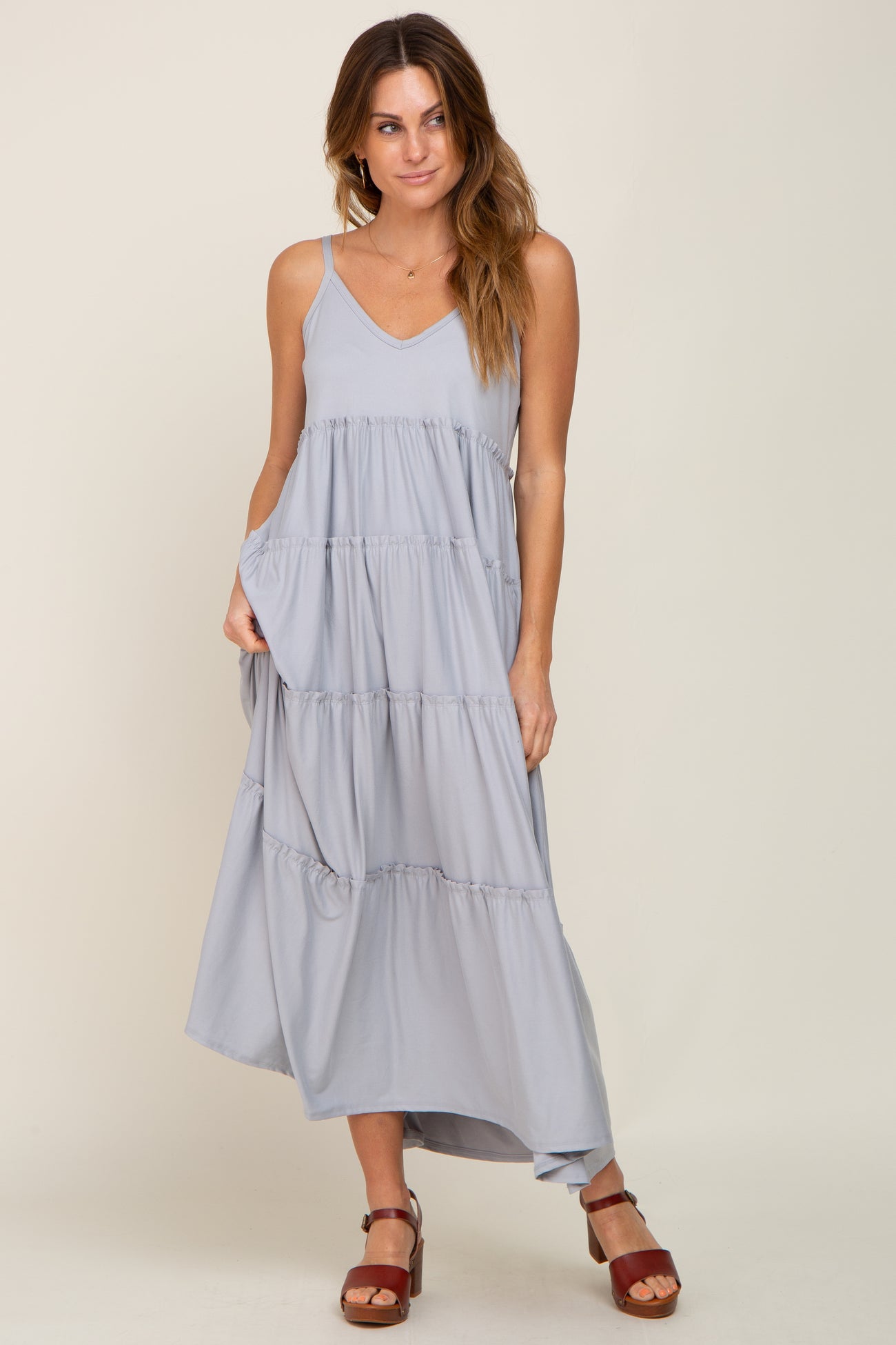 A solid hue maxi dress featuring adjustable straps, a v-neckline, side pockets, and a tiered body.