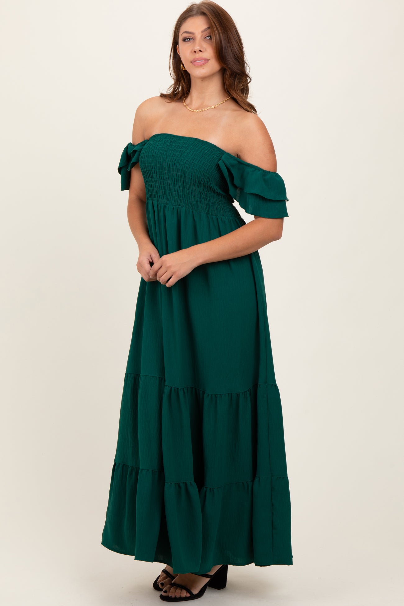 Hunter Green Smocked Ruffle Off Shoulder Tiered Maxi Dress