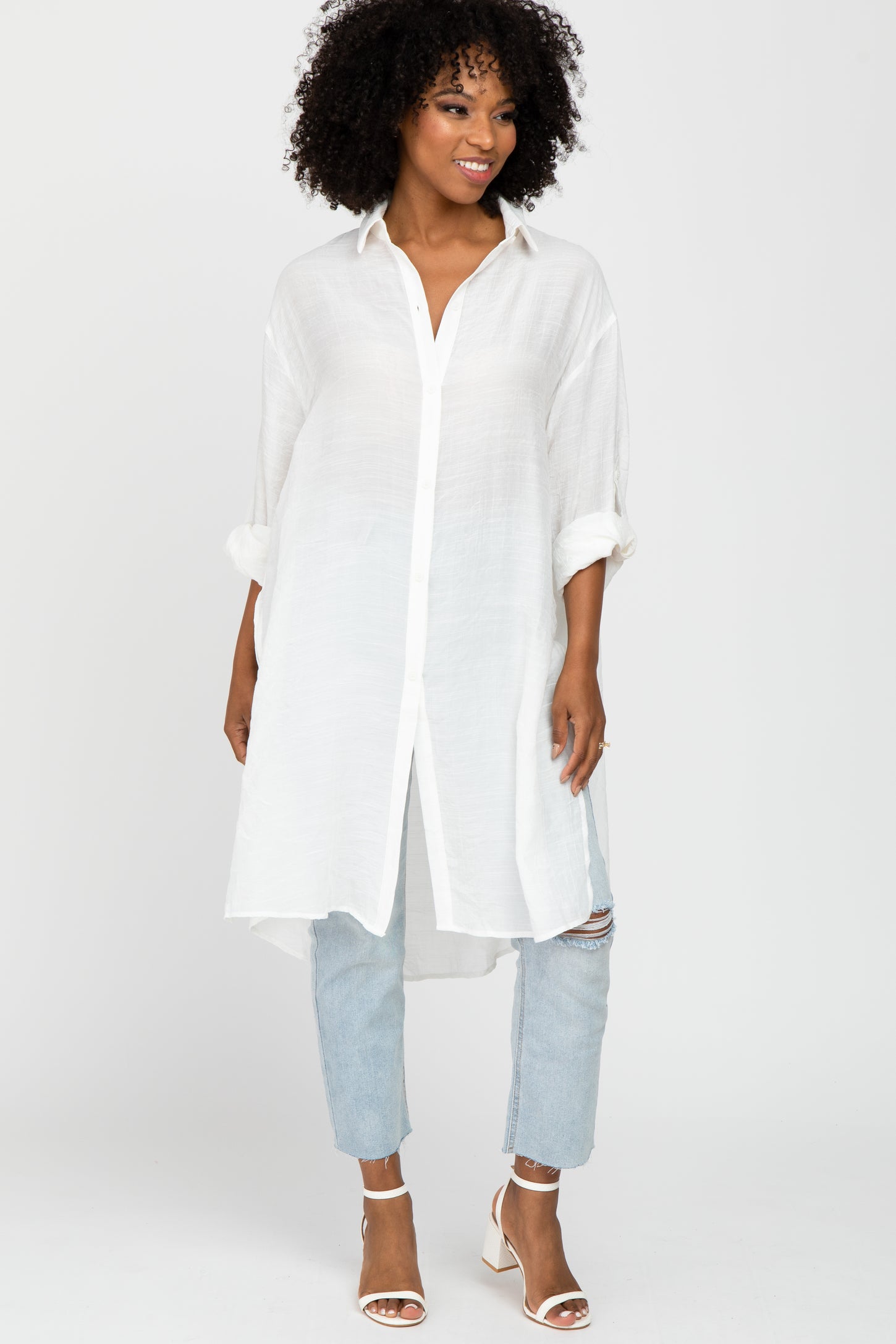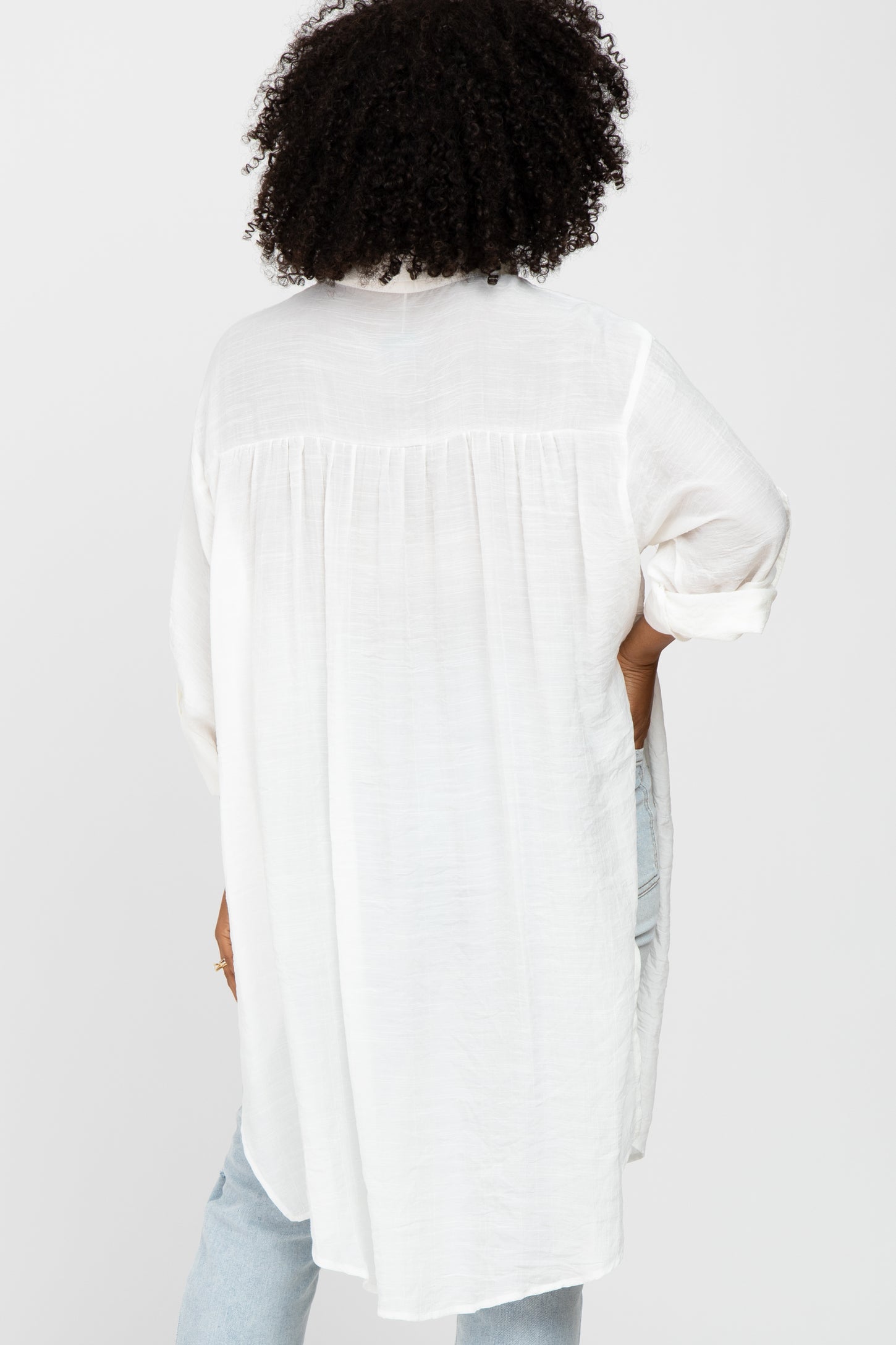 A solid top featuring a collared neckline, a button down front, an oversized fit, side slits and long sleeves.