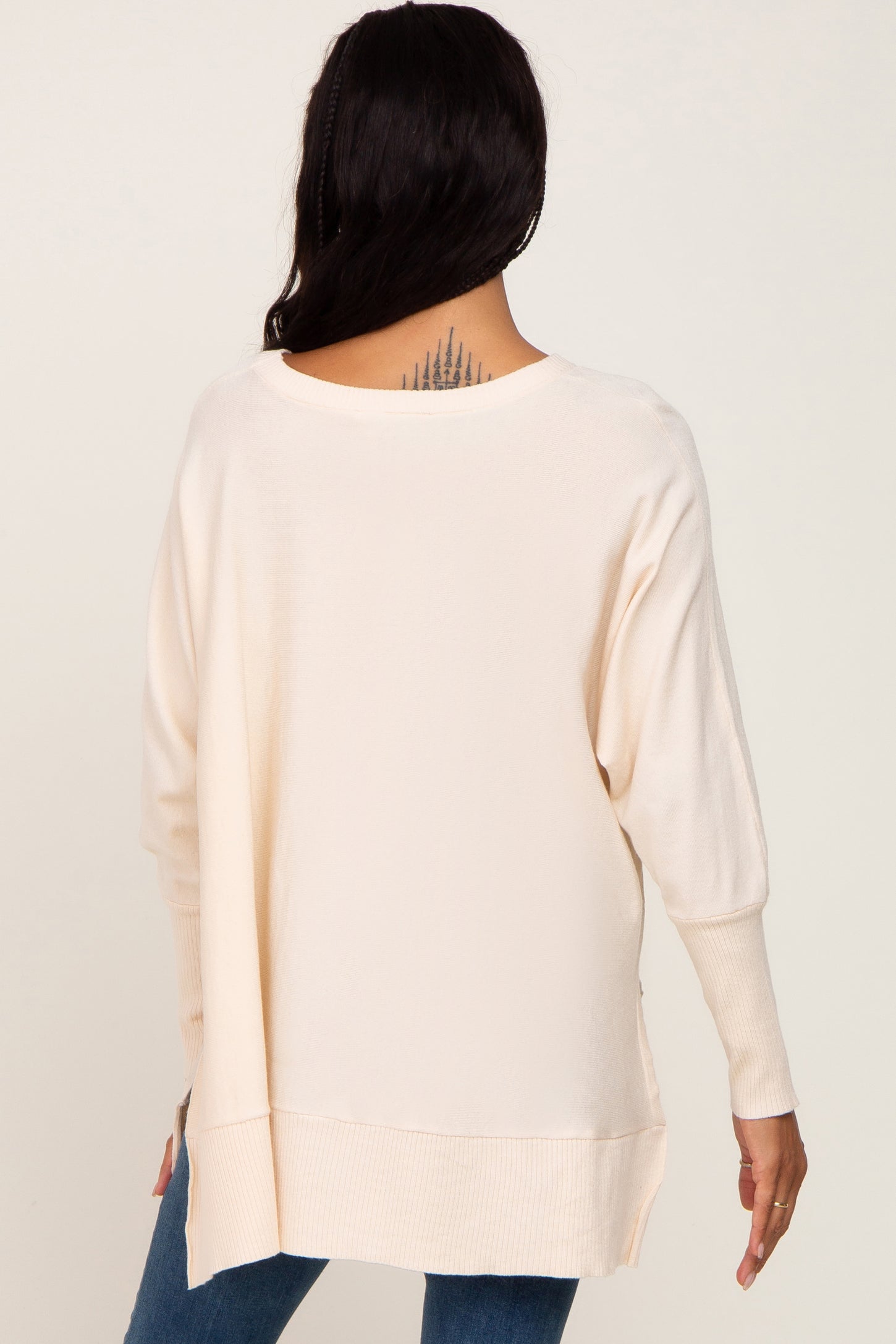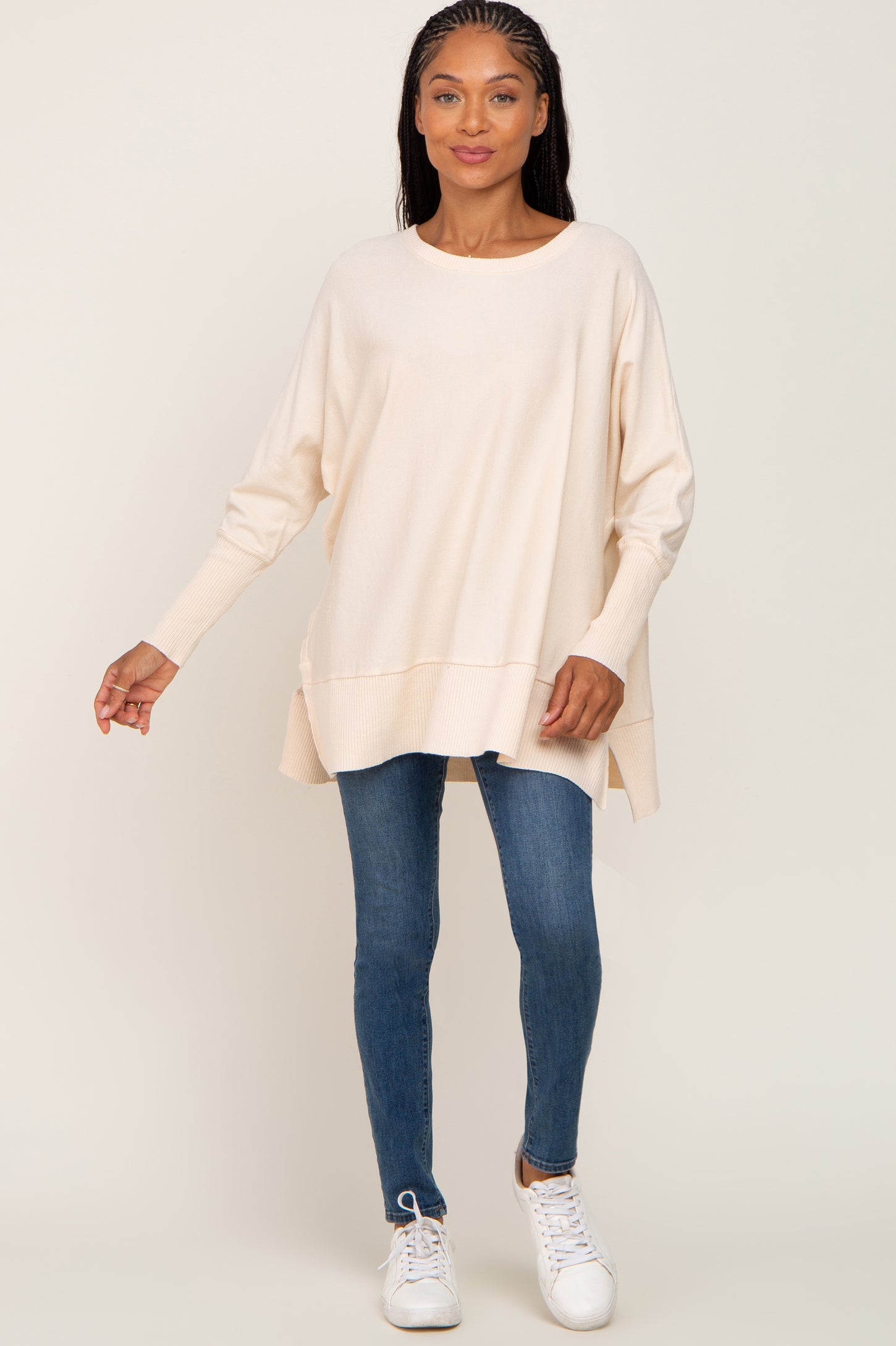 An ultra-soft knit lightweight sweater featuring a wide rounded neckline, long dolman sleeves, side slits and ribbed hi-low hem.