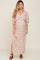 A maternity maxi dress featuring a double v-neckline, short dolman sleeves, an adjustable tie at the back of the neck, a smocked elastic band at the waist and a side slit.