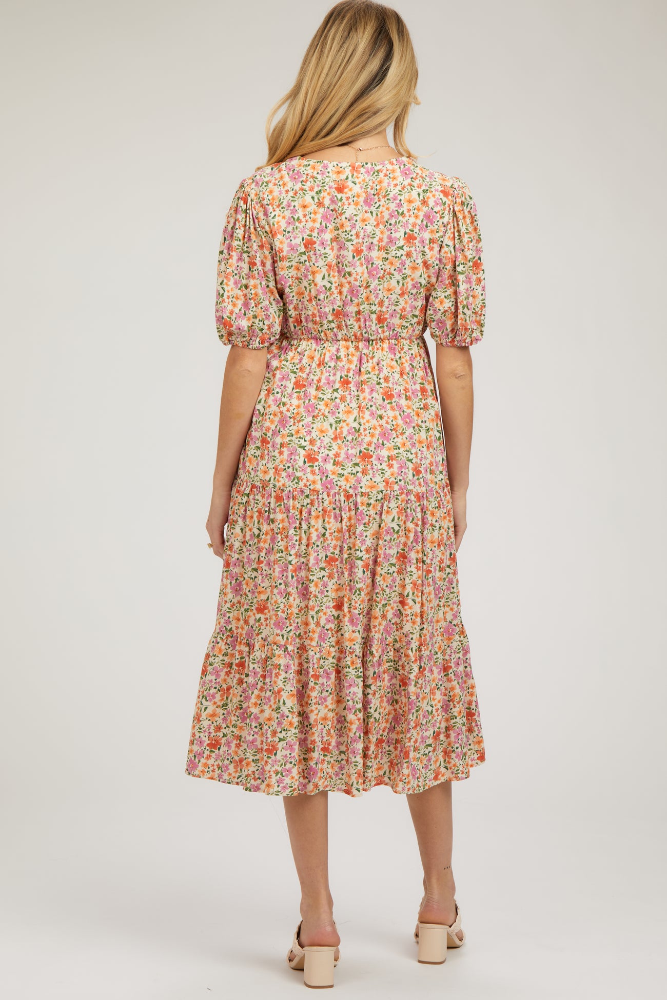 Ivory Floral Button Front Ruffle Hem Maternity Midi Dress