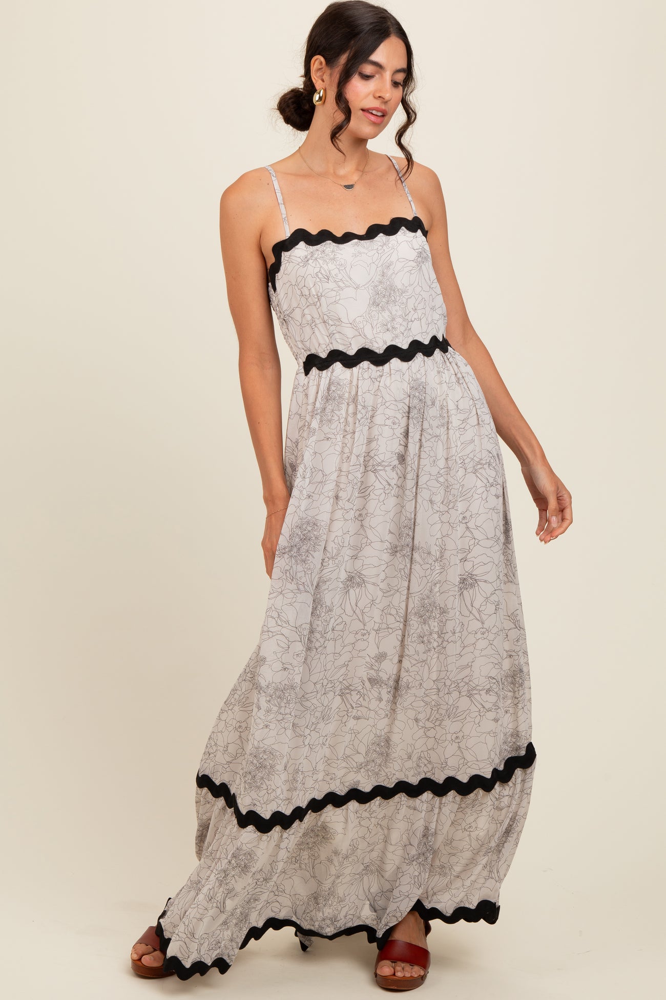 Embrace effortless elegance with our Ivory Floral Contrast Trim Maternity Maxi Dress. Designed for comfort and style, this dress features a delicate floral print on a soft ivory background, beautifully accented with bold black scalloped trim along the neckline, waist, and hem. The adjustable spaghetti straps and flowing maxi silhouette provide a flattering fit throughout your pregnancy, ensuring you feel confident at every stage. Perfect for baby showers, special occasions, or a stylish everyday look, this dress combines timeless charm with maternity-friendly design. Step out in comfort and grace with this must-have maternity maxi dress.
