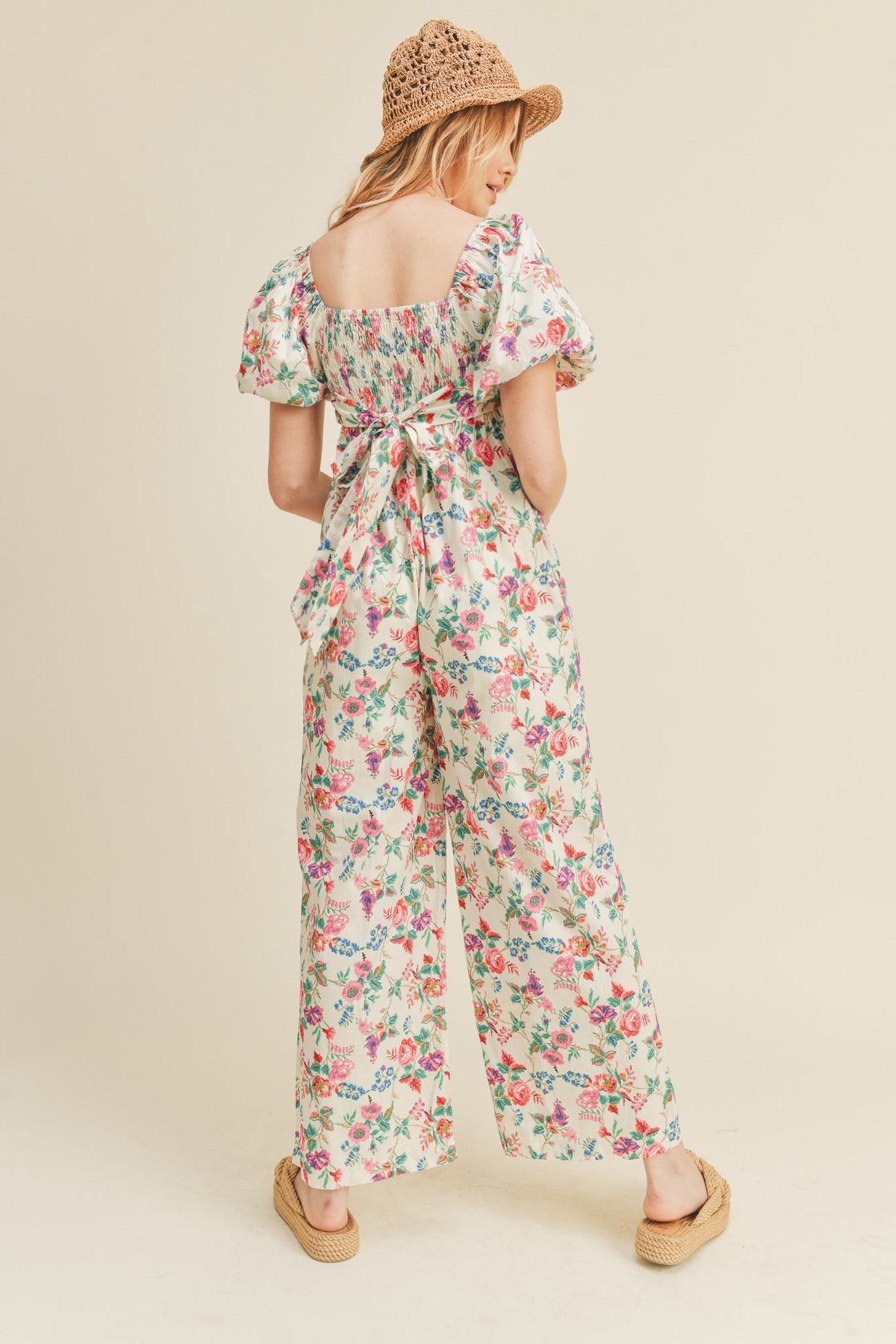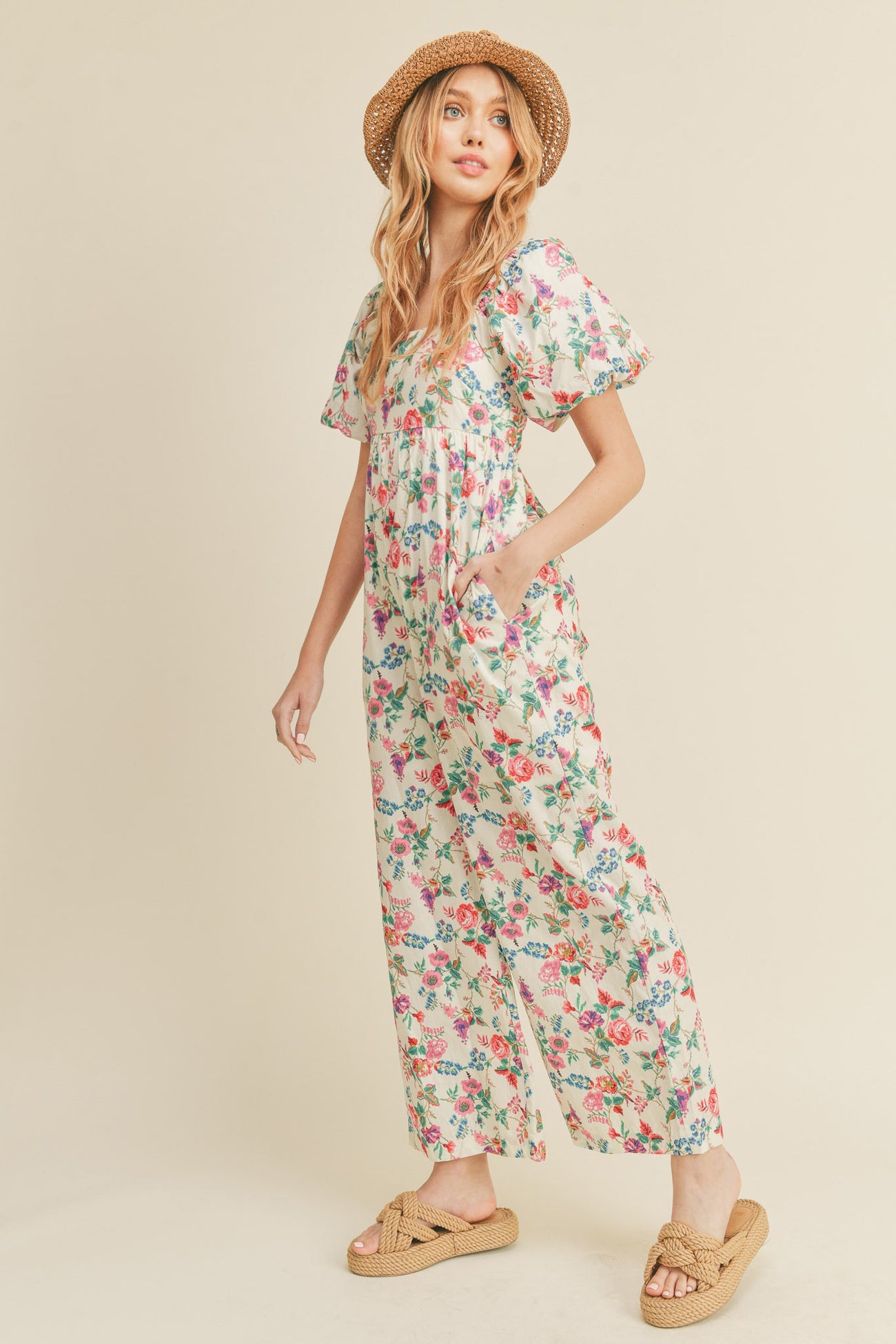 Ivory Floral Floral Wide Leg Puff Sleeve Jumpsuit