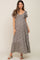 A floral maternity maxi with a v-neckline, short puff sleeves, side pockets, and a tiered skirt.