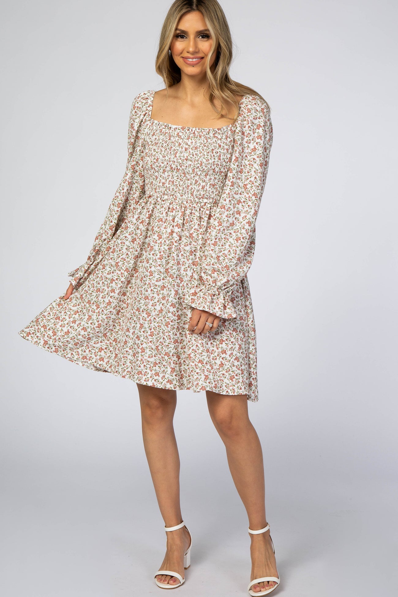 Ivory Floral Smocked Long Sleeve Dress