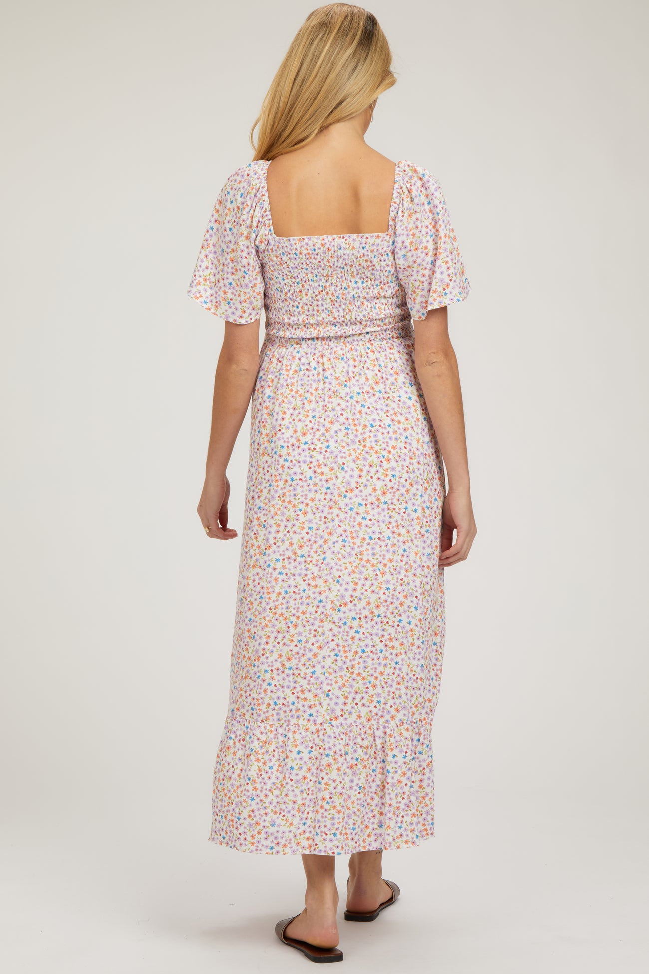 A floral print maternity maxi dress featuring short sleeves, a smocked top, a ruffle hem and a square neckline.