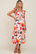 A floral maternity midi dress with a squared neckline, a smocked top, short ruffle layered cap sleeves, and a ruffle gathered bottom Tier.