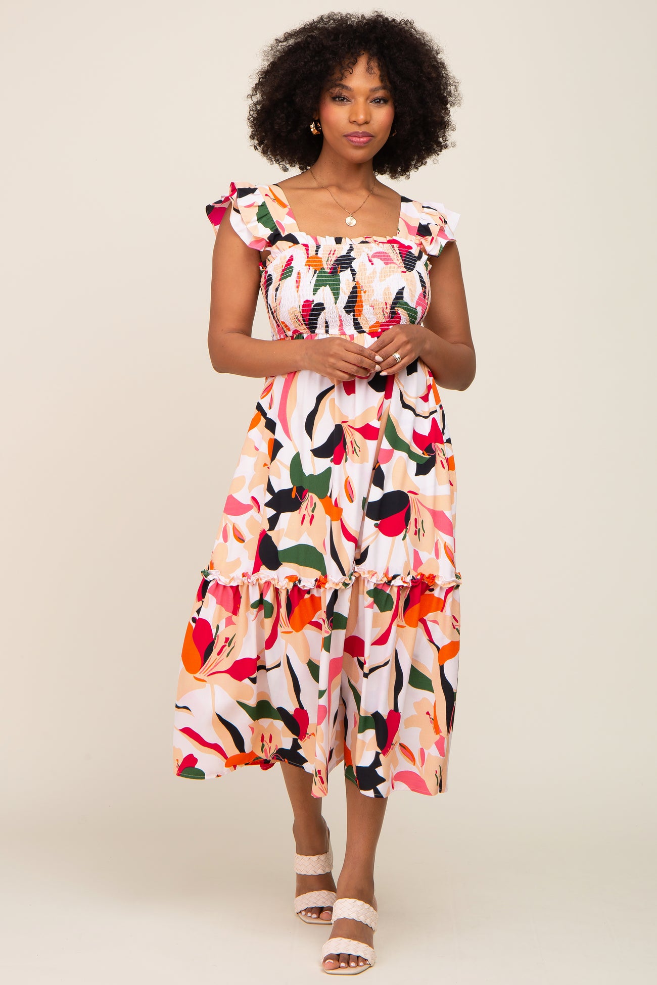 Ivory Floral Smocked Ruffle Tier Maternity Midi Dress