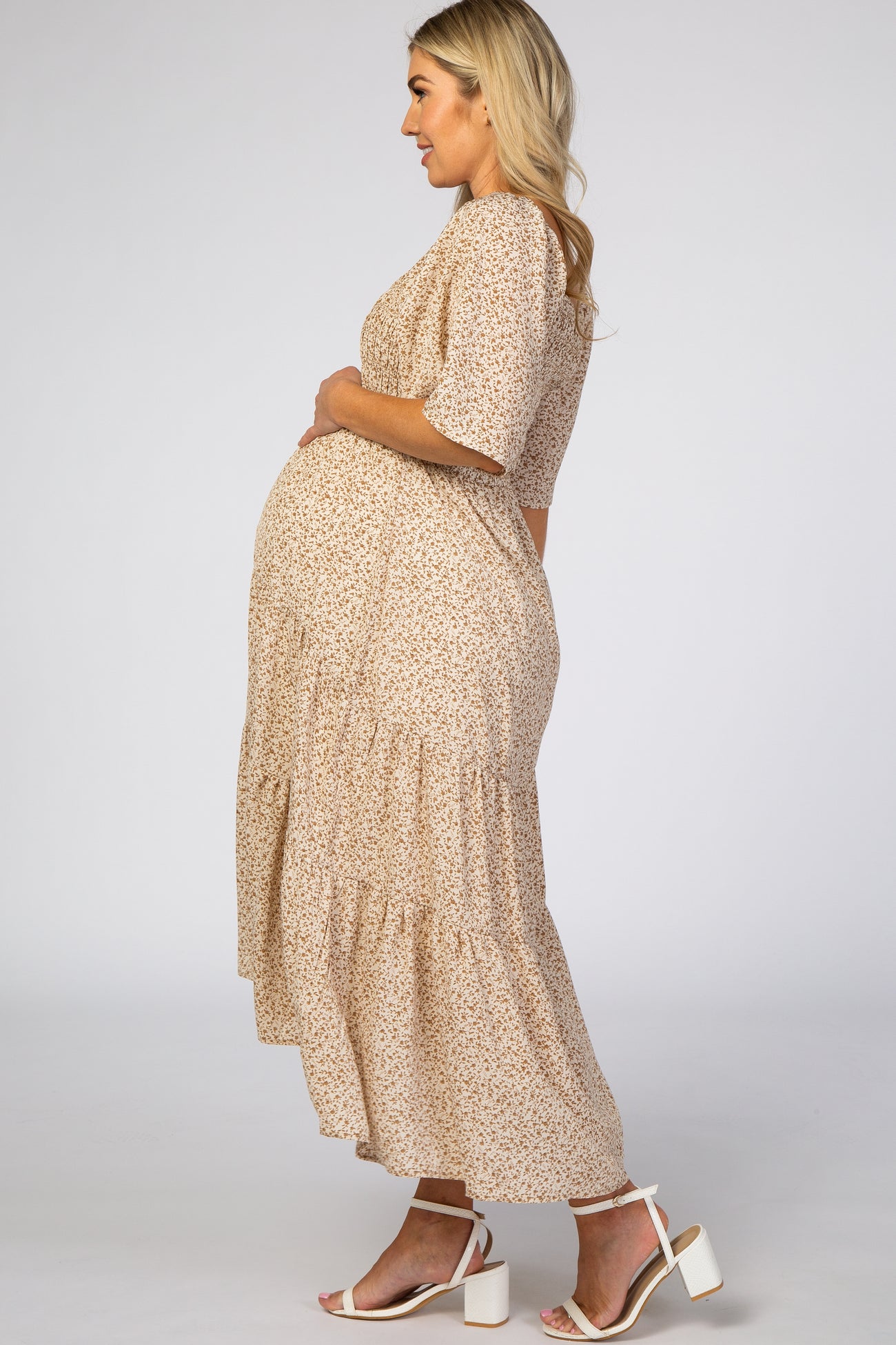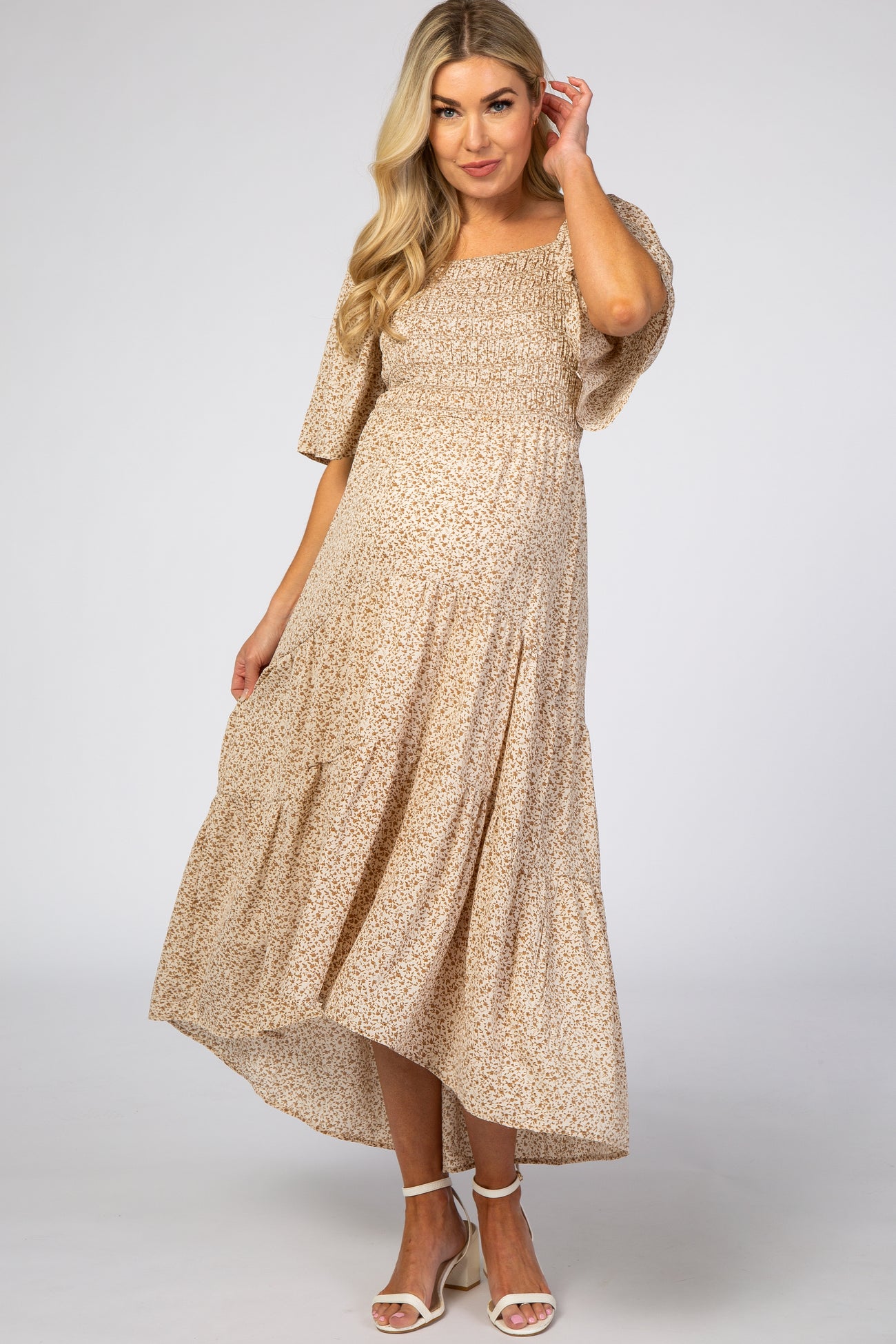A floral maternity midi dress featuring a square neckline, a smocked bodice, short ruffle sleeves, pleated tiers and double lined.