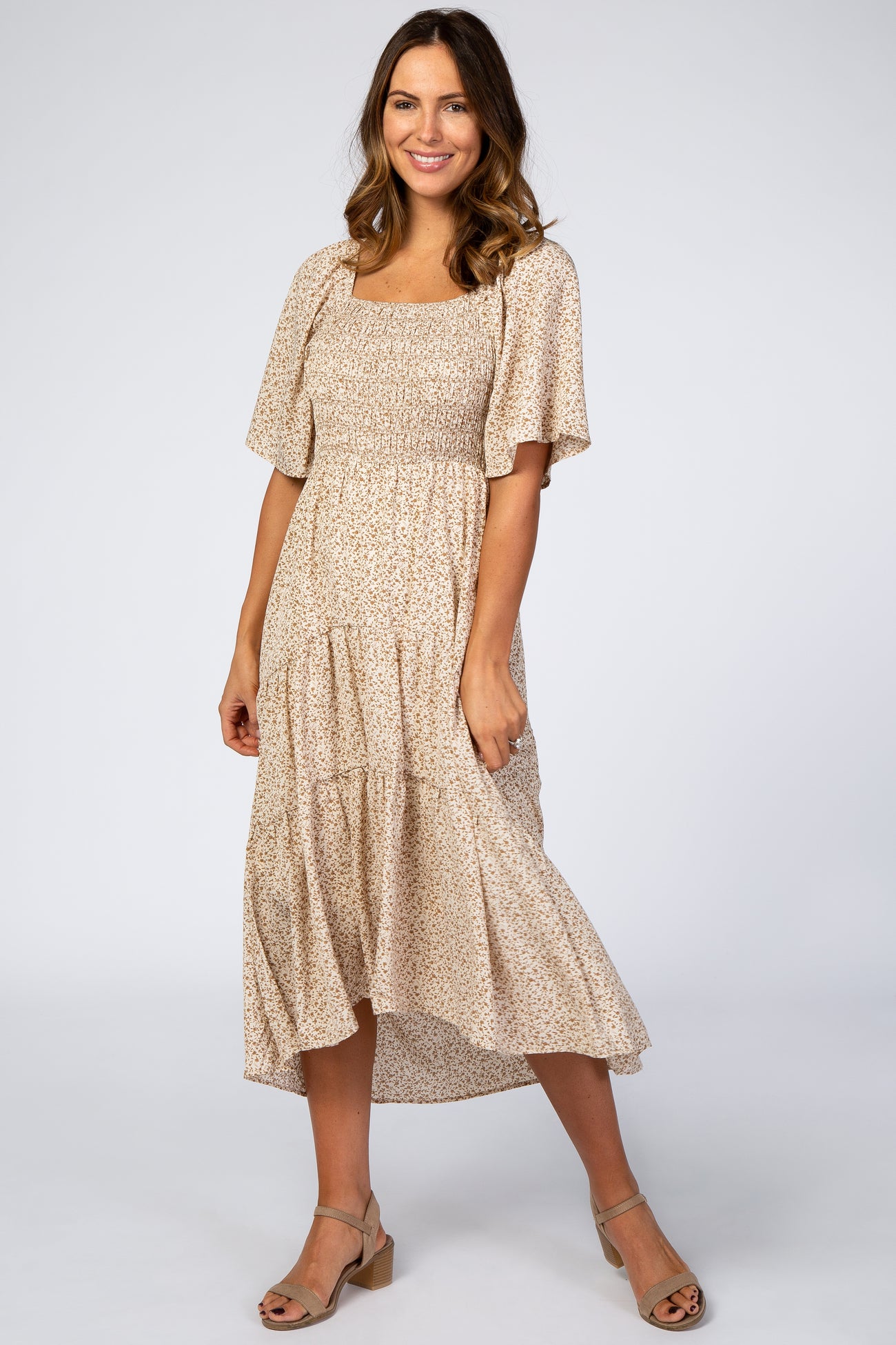 A floral midi dress featuring a square neckline, a smocked bodice, short ruffle sleeves, pleated tiers and double lined.