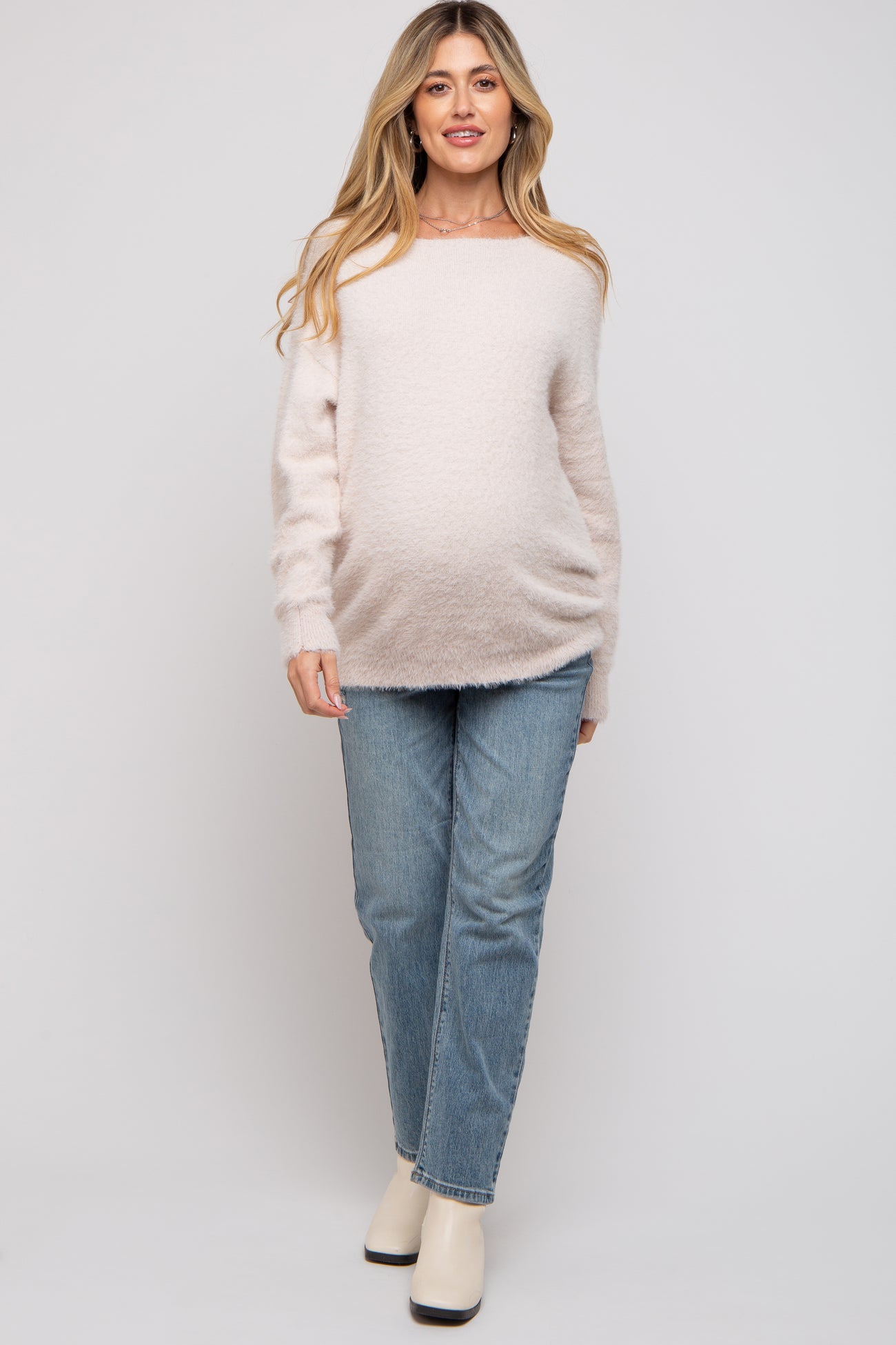 Ivory Fuzzy Knit Boat Neck Maternity Sweater