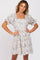 A printed short dress with a ruffle accent square neckline, puff sleeves and tiered body. Dress is double lined.