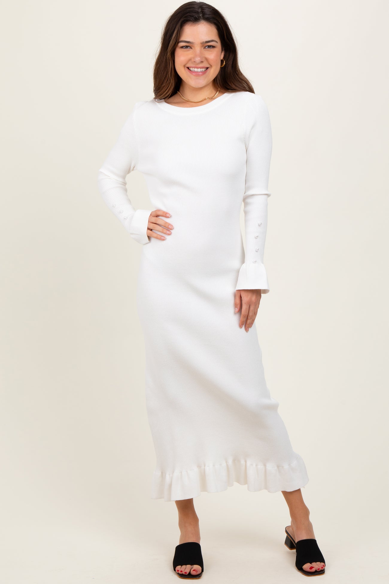 Elevate your wardrobe with our Ivory Ribbed Knit Bow Back Maxi Dress, the perfect blend of elegance and comfort. Crafted from soft, stretchy ribbed knit fabric, this maxi dress features long sleeves with delicate button details and flared cuffs for a refined finish. The fitted silhouette gracefully hugs your figure, while the ruffled hem adds a touch of femininity. The standout bow back detail offers a charming surprise, making this dress perfect for both casual outings and special occasions. Pair it with heels for a chic look or keep it casual with sandals. Your new favorite dress awaits!