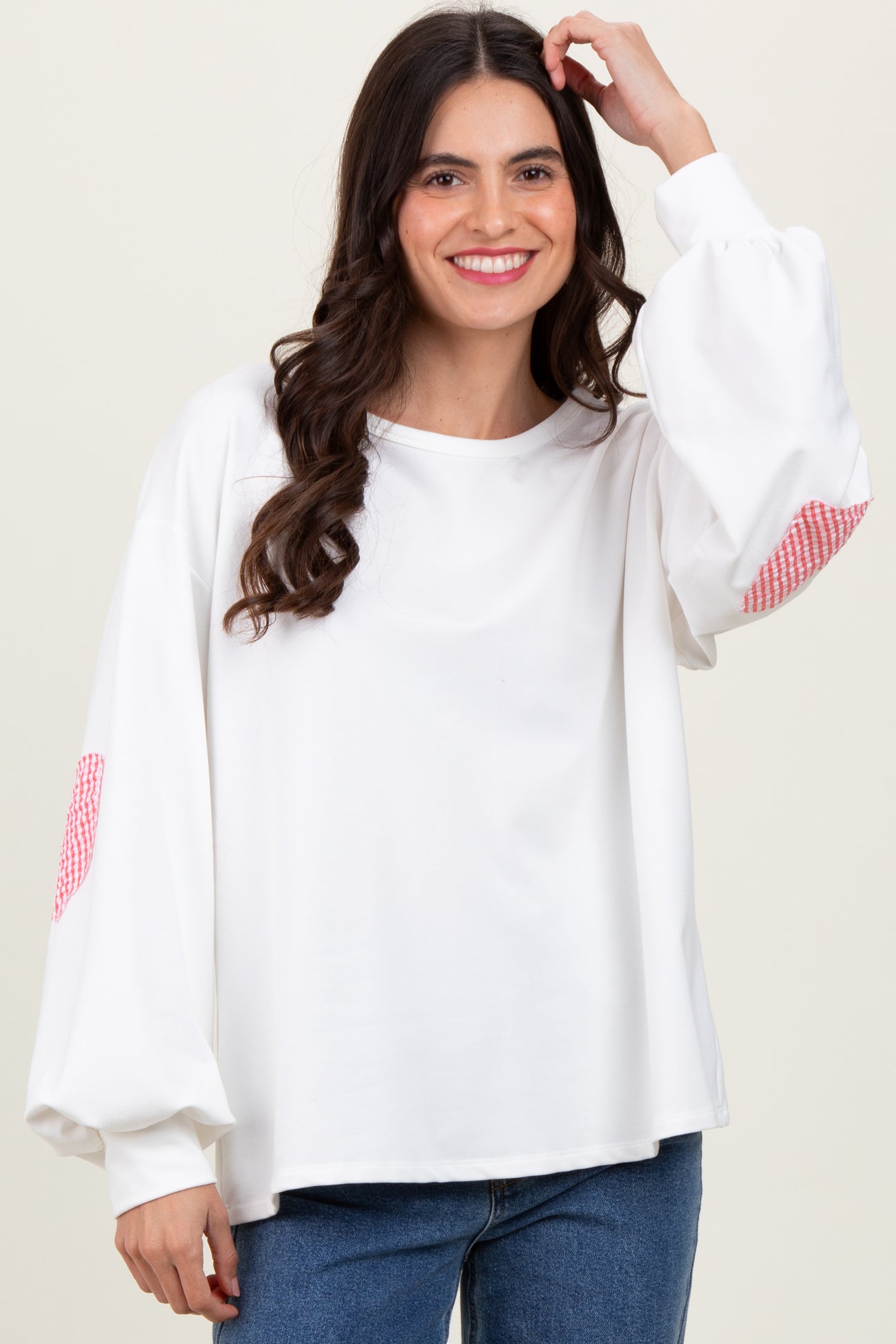 Elevate your casual wardrobe with our Ivory Solid Long Sleeve Heart Patch Top. Crafted from soft, breathable fabric, this relaxed-fit top features charming red heart patches on the elbows for a playful yet stylish touch. The balloon sleeves add a trendy, voluminous silhouette while the crew neckline keeps it classic. Perfect for pairing with your favorite jeans or skirts, this versatile top effortlessly blends comfort and cute. Whether you're out for a casual day or cozying up at home, make a subtle statement with this unique piece designed for everyday wear. Available in all sizes.