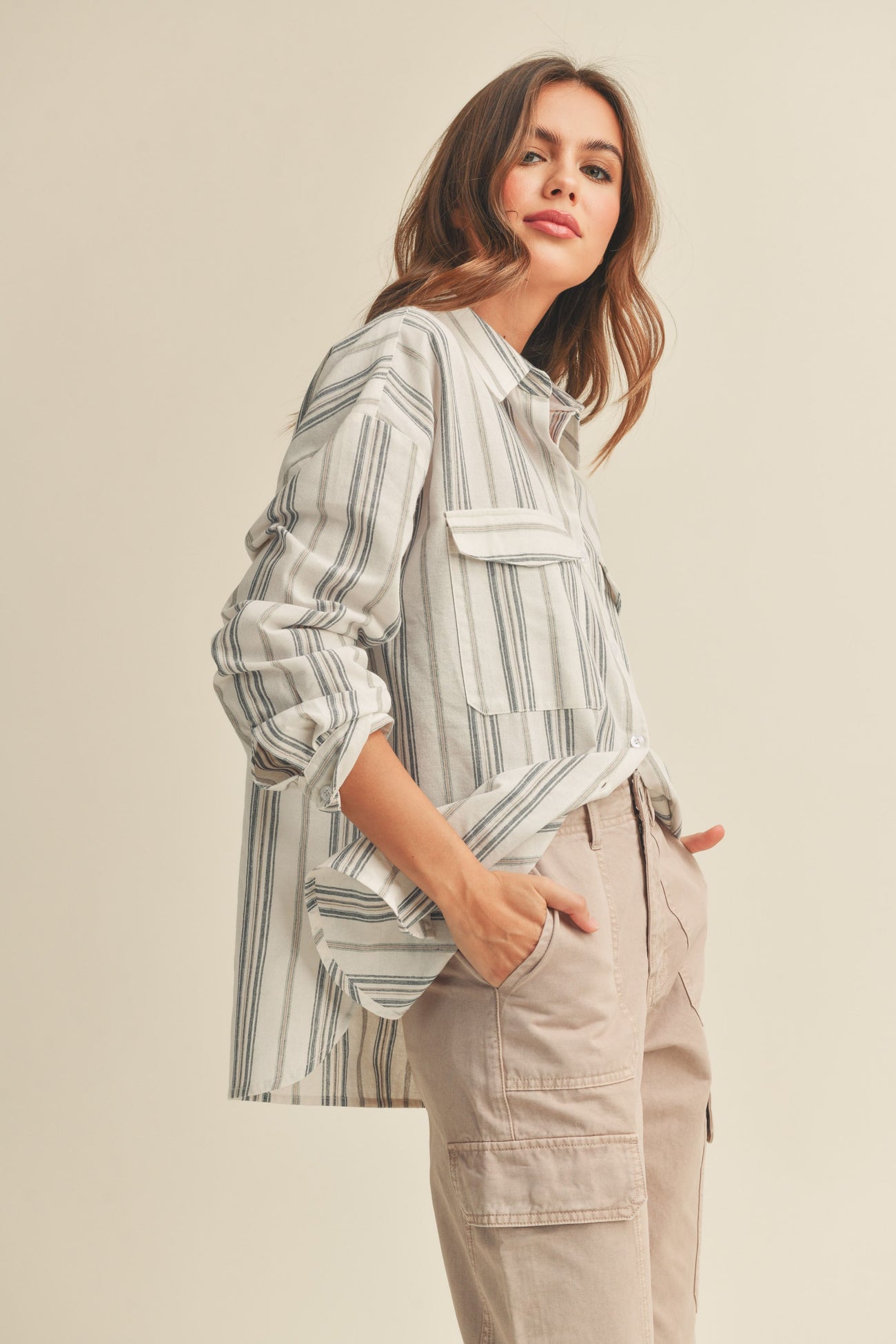 Ivory Striped Front Pocket Button Up Top