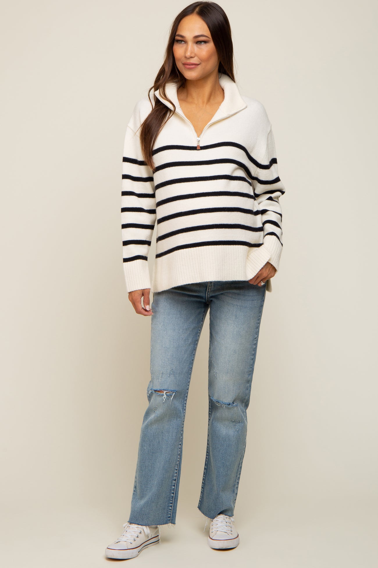 Stay cozy and stylish through every trimester with our Ivory Striped Half Zip Maternity Sweater! Designed with soft, stretchy knit fabric, this sweater gently hugs your growing bump for all-day comfort. The classic ivory base is accented by chic horizontal stripes, making it easy to pair with jeans, leggings, or skirts. The handy half zip front adds a trendy touch and allows for easy nursing access post-baby. Ribbed cuffs and hem give a refined finish you'll love. Perfect for layering or wearing solo, this sweater is a must-have for your maternity wardrobe!