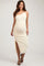 A textured fitted maternity midi dress featuring a one-shoulder neckline, adjustable cami straps and adjustable side ruching.