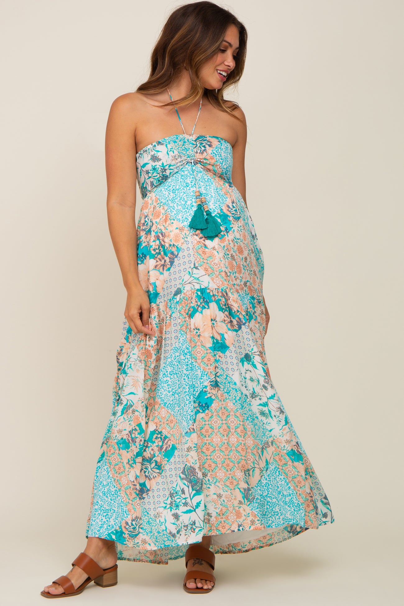 A floral maternity maxi dress with a halter tie, a cinched tassel front tie. a sweetheart neckline, a smocked back, and a side zipper closure. Skirt is lined.