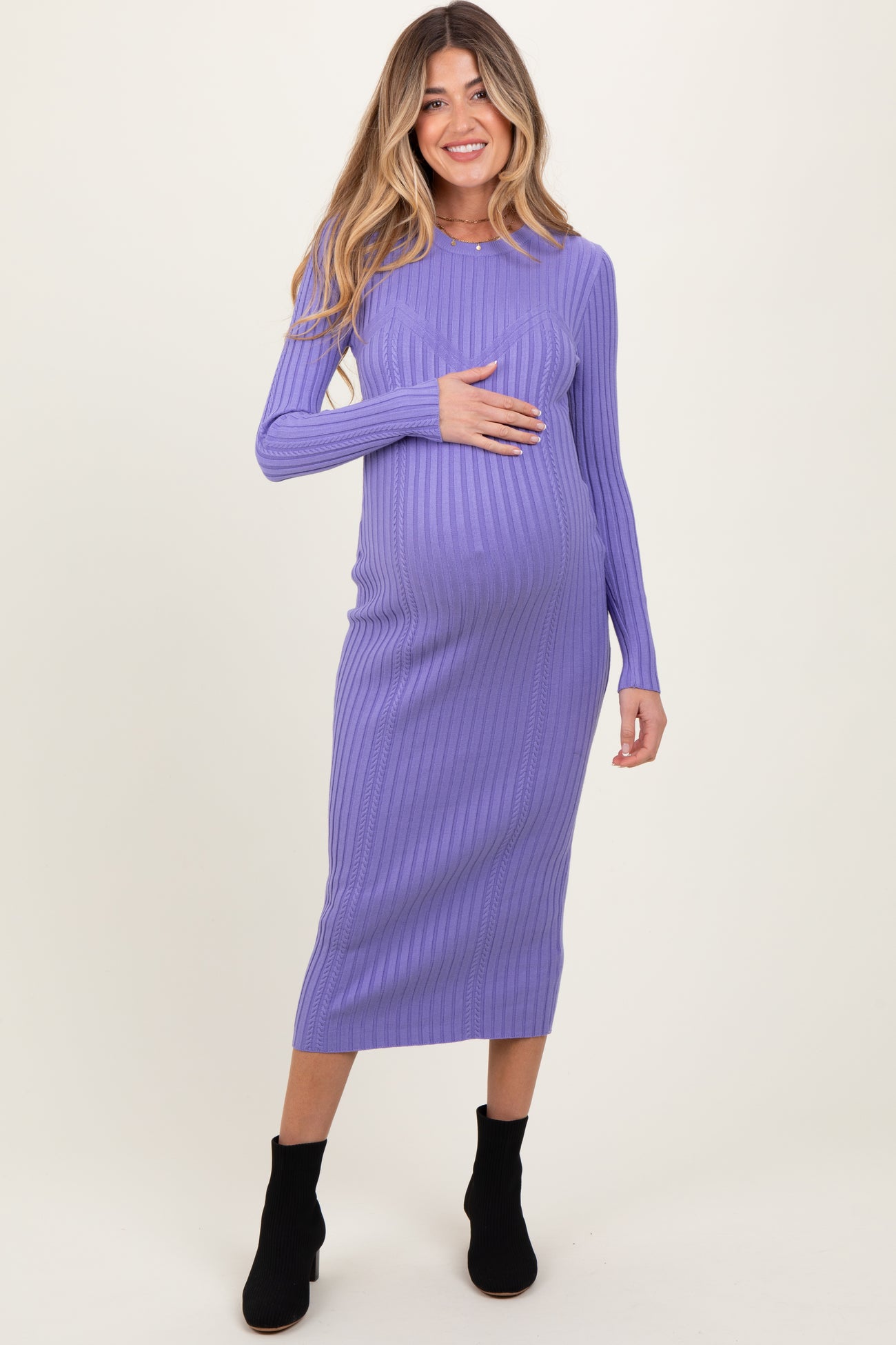 Lavender Contrast Ribbed Knit Maternity Midi Dress
