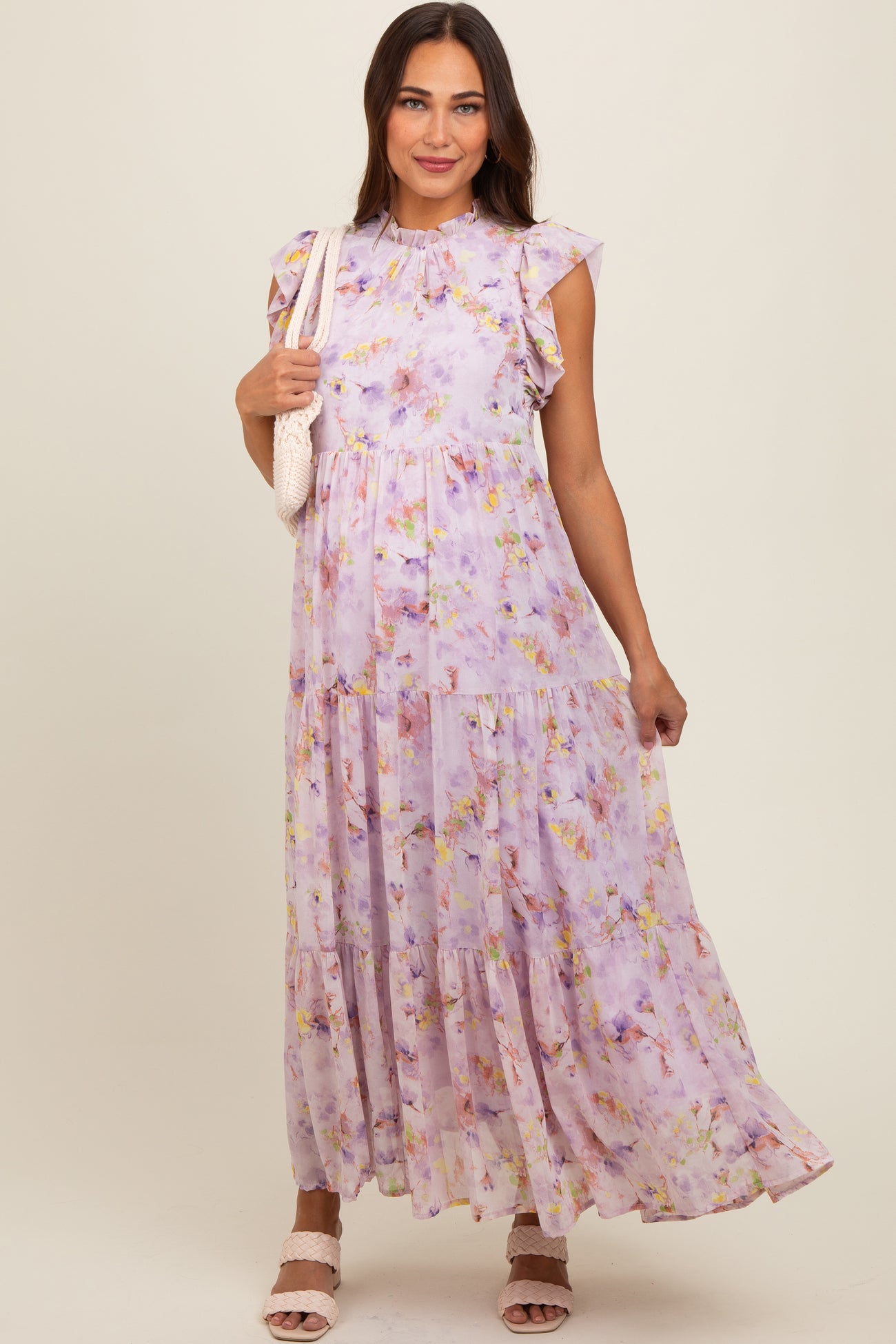Lavender Floral Chiffon Ruffle Shoulder Tiered Maternity Maxi Dress