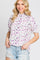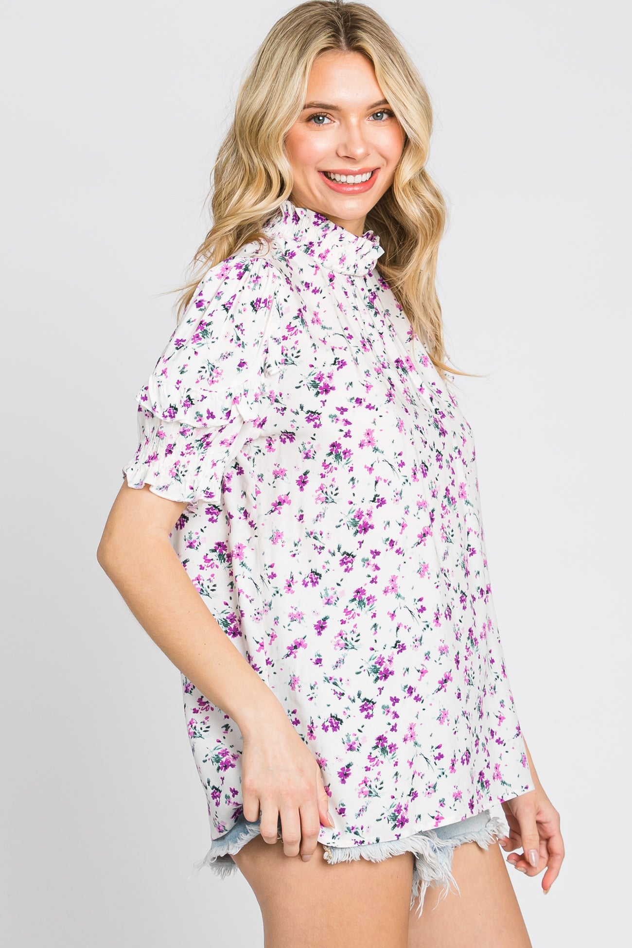 A floral blouse featuring a smocked mock neckline, ruffle puff sleeves and a back keyhole cutout with a button closure.