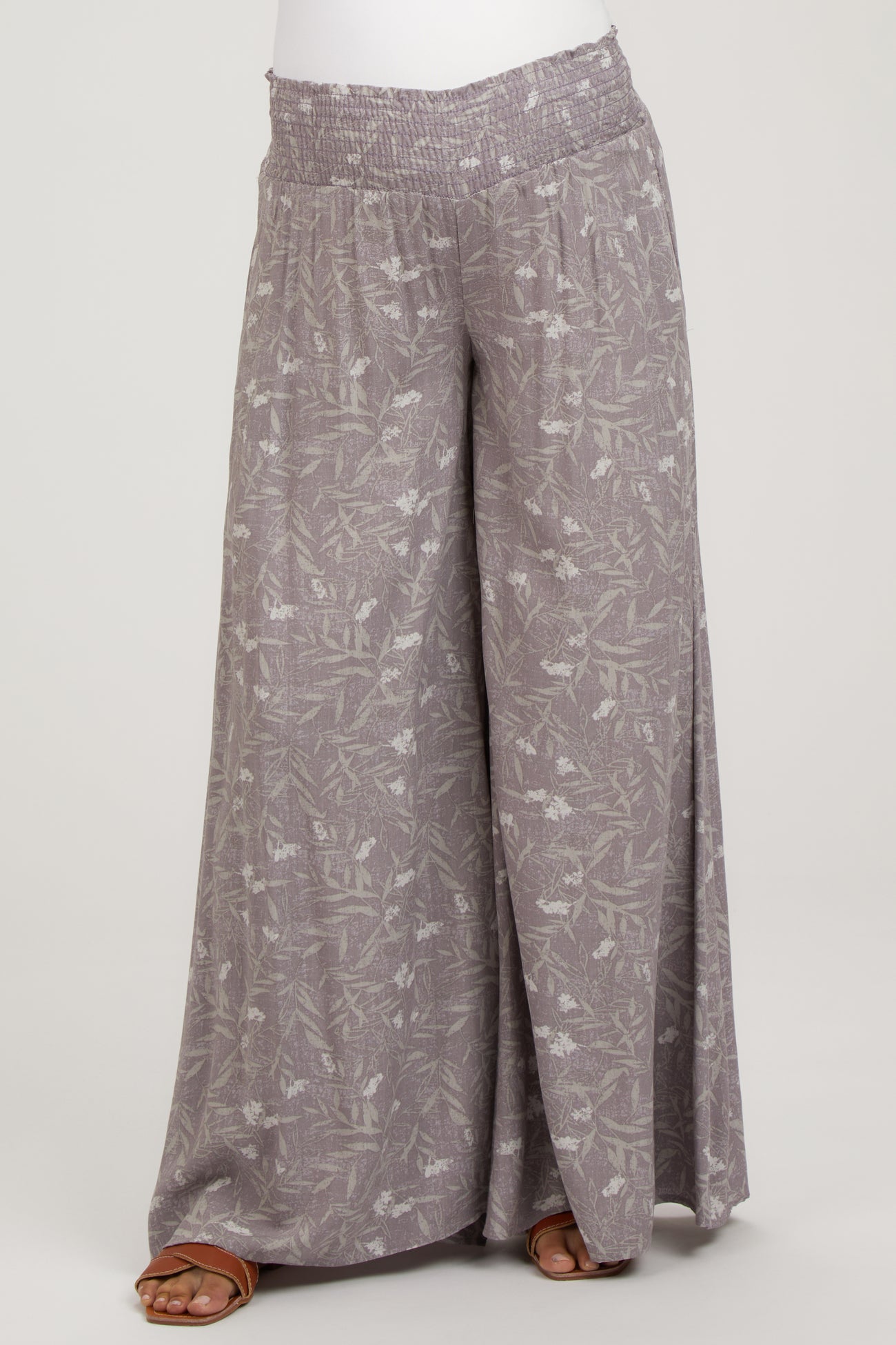 A floral maternity pant with a smocked elastic waist, side pockets, and wide pant legs.
