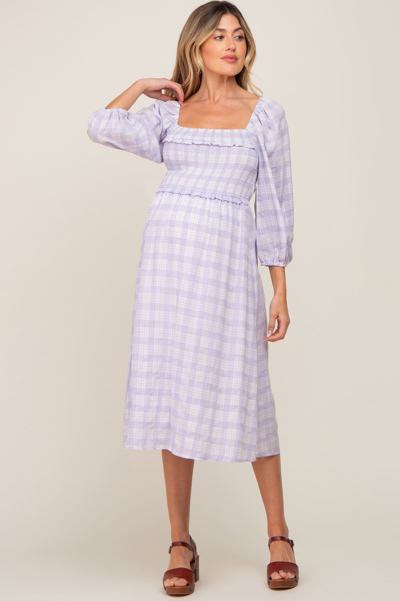 Lavender Plaid Smocked Square Neck Lace-Up Back Maternity Midi Dress