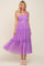 Details A mesh midi dress featuring a smocked bodice, adjustable shoulder ties, and a ruffle tiered skirt. Content + Care