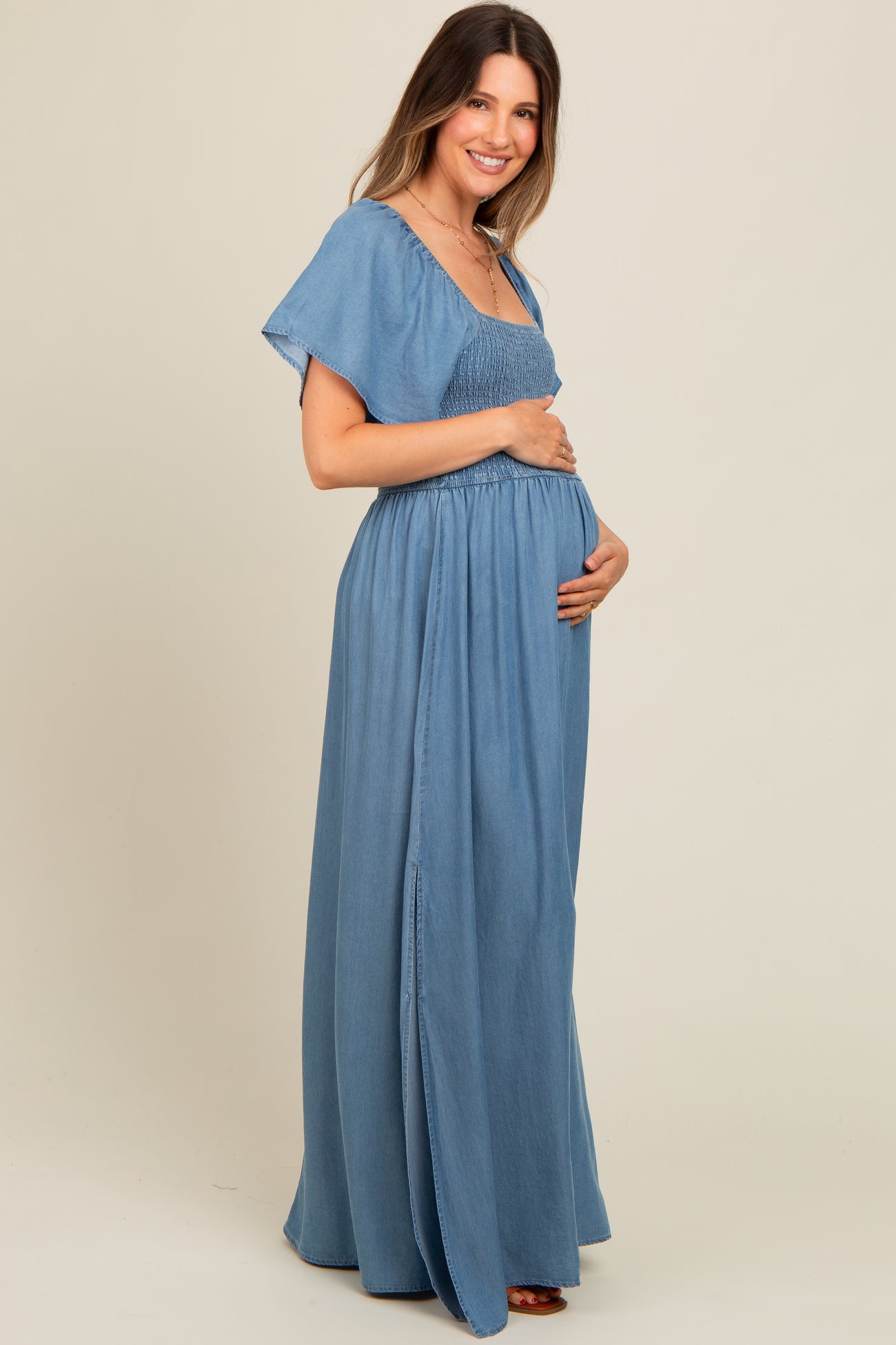 Light Blue Chambray Smocked Maternity Maxi Dress