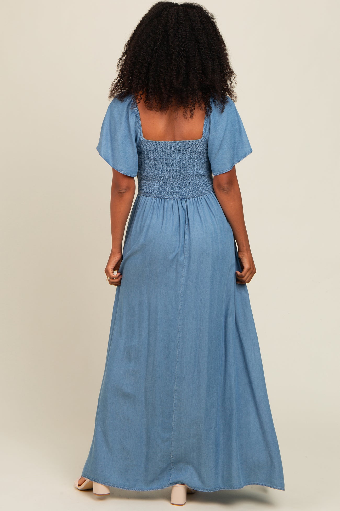Embrace effortless style with our Light Blue Chambray Smocked Maxi Dress. Featuring a flattering smocked bodice and a square neckline, this dress highlights your silhouette while offering comfort. The soft chambray fabric gives it a casual yet chic vibe, perfect for day or evening wear. Flutter sleeves add a touch of feminine elegance, and the flowing maxi skirt with a side slit ensures ease of movement. Pair it with sandals for a relaxed look or dress it up with heels for special occasions. Ideal for warm seasons, this versatile maxi dress is a must-have addition to your wardrobe.