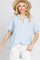Details A light blue striped top featuring a collared neck, a v-neckline, short sleeves and a rouned hi-low hem. Content + Care