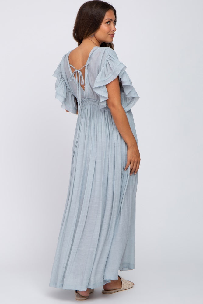 Light Blue Deep V-Neck Button Down Maternity Maxi Dress