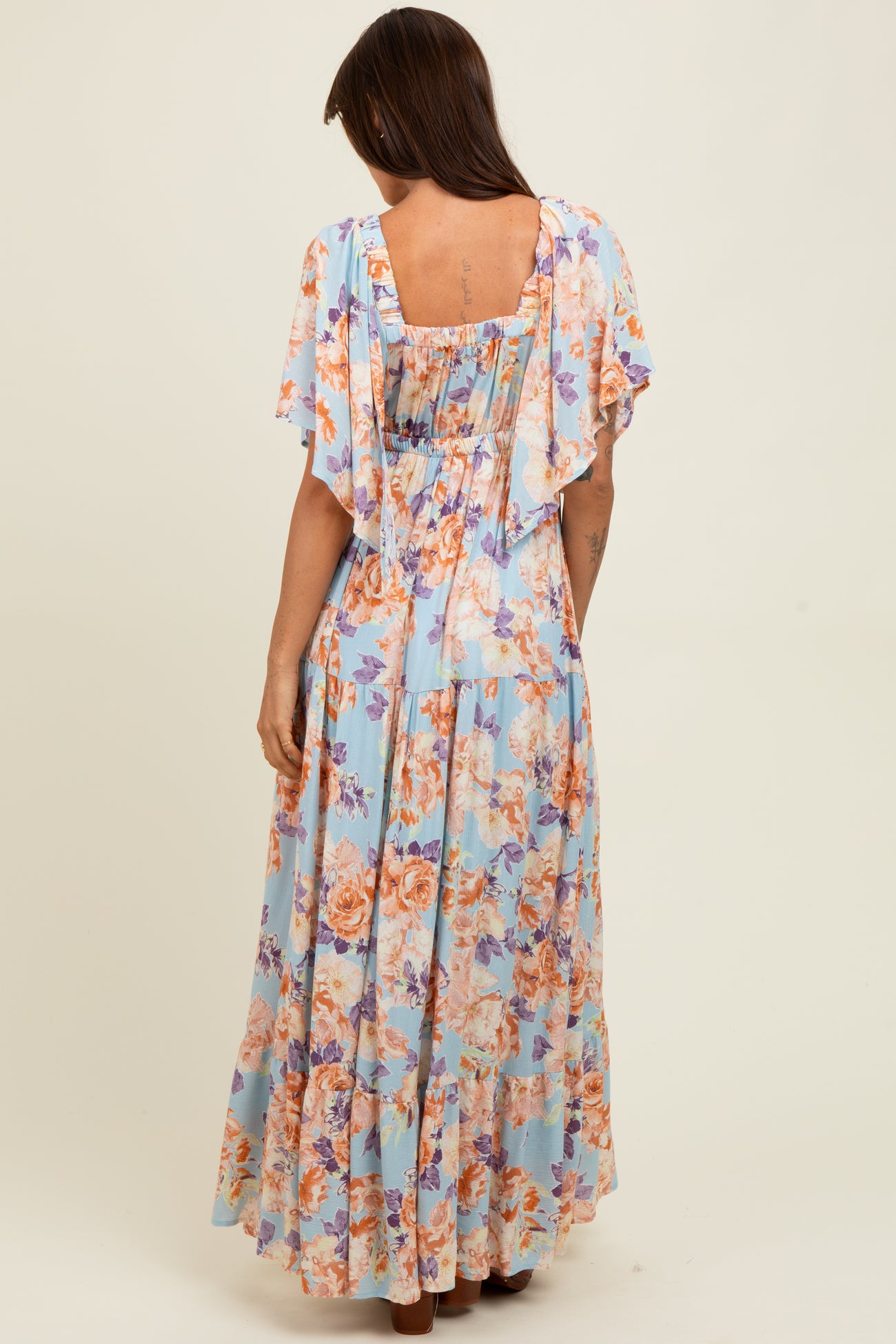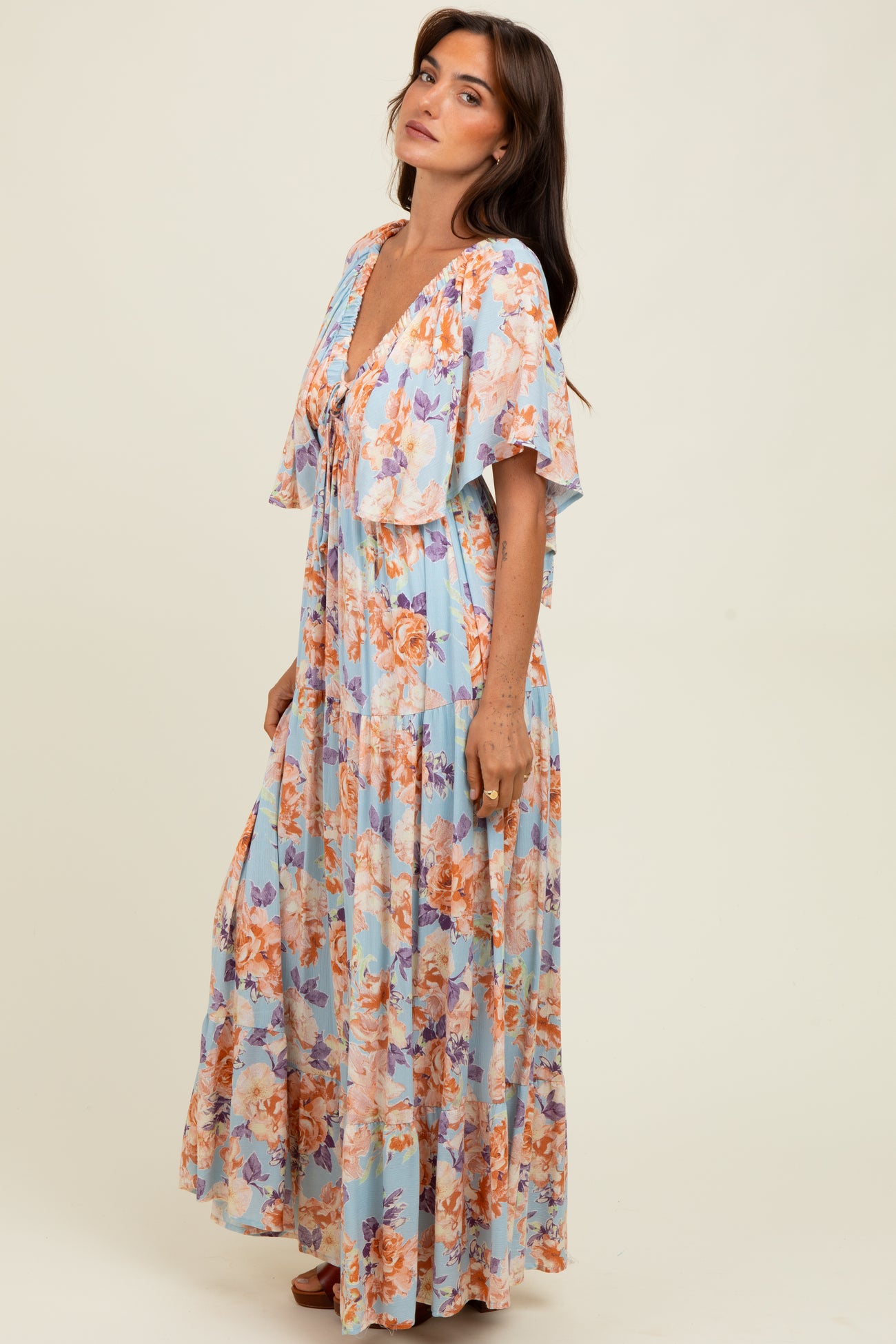 Light Blue Floral Flyway Sleeve V-Neck Tiered Maxi Dress