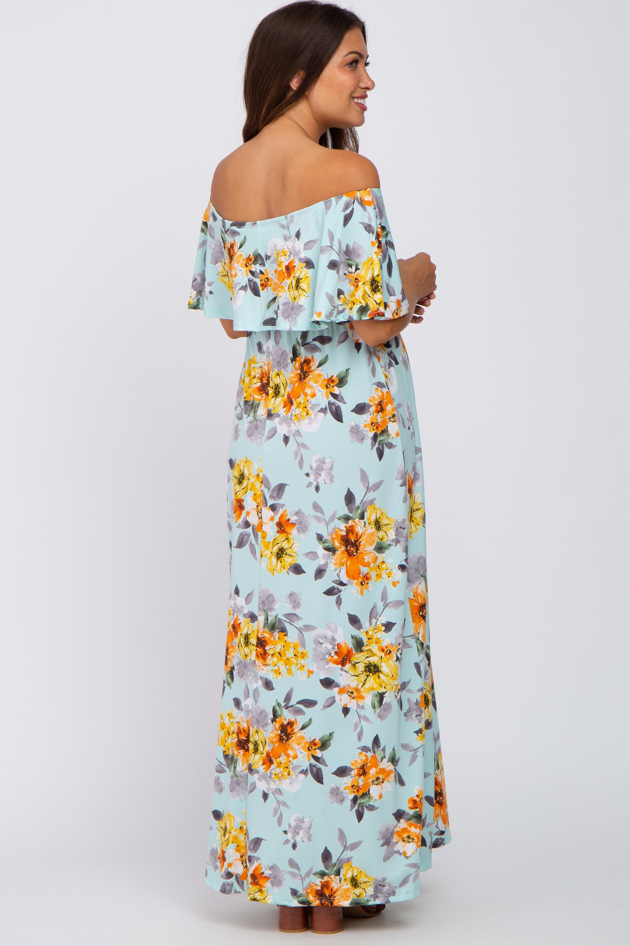 Light Blue Floral Off Shoulder Maternity Maxi Dress