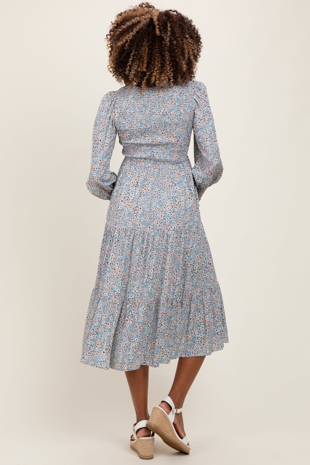 Light Blue Floral Smocked Bubble Sleeve Maternity Midi Dress