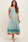 A floral maternity midi dress featuring a ruffle accent squared neckline, a smocked top, flutter cap sleeves, a ruffle accent at the waist, side pockets, and a gathered bottom tier. Dress is fully lined.