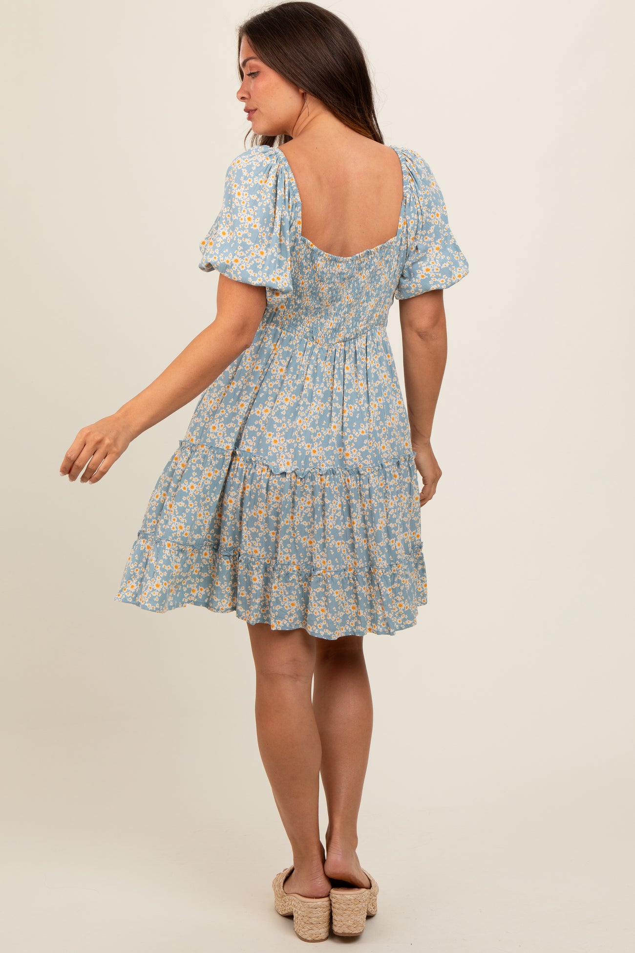 Light Blue Floral Smocked Short Sleeve Tiered Maternity Dress