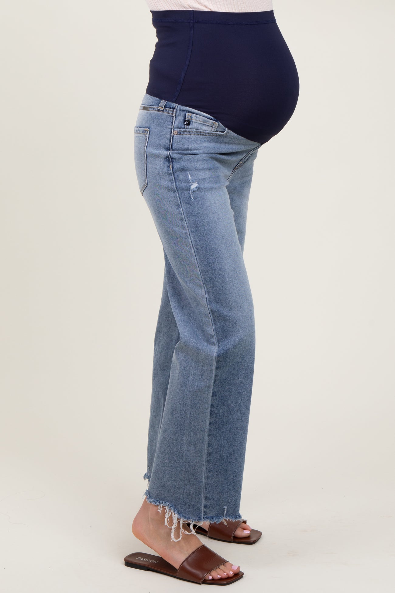 Light Blue Fringe Hem Maternity Wide Leg Jeans