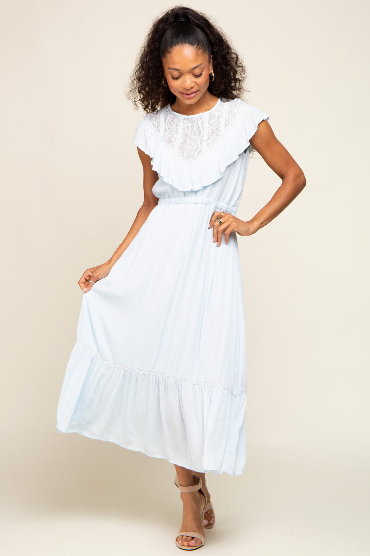 A solid midi dress with a lace inset detail in front and ruffle accents. Dress is partially lined with elastic waistline and keyhole opening with button closure in back.