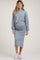 A knit maternity set featuring a long sleeve crop top with a rounded neckline. Midi skirt features a back slit.