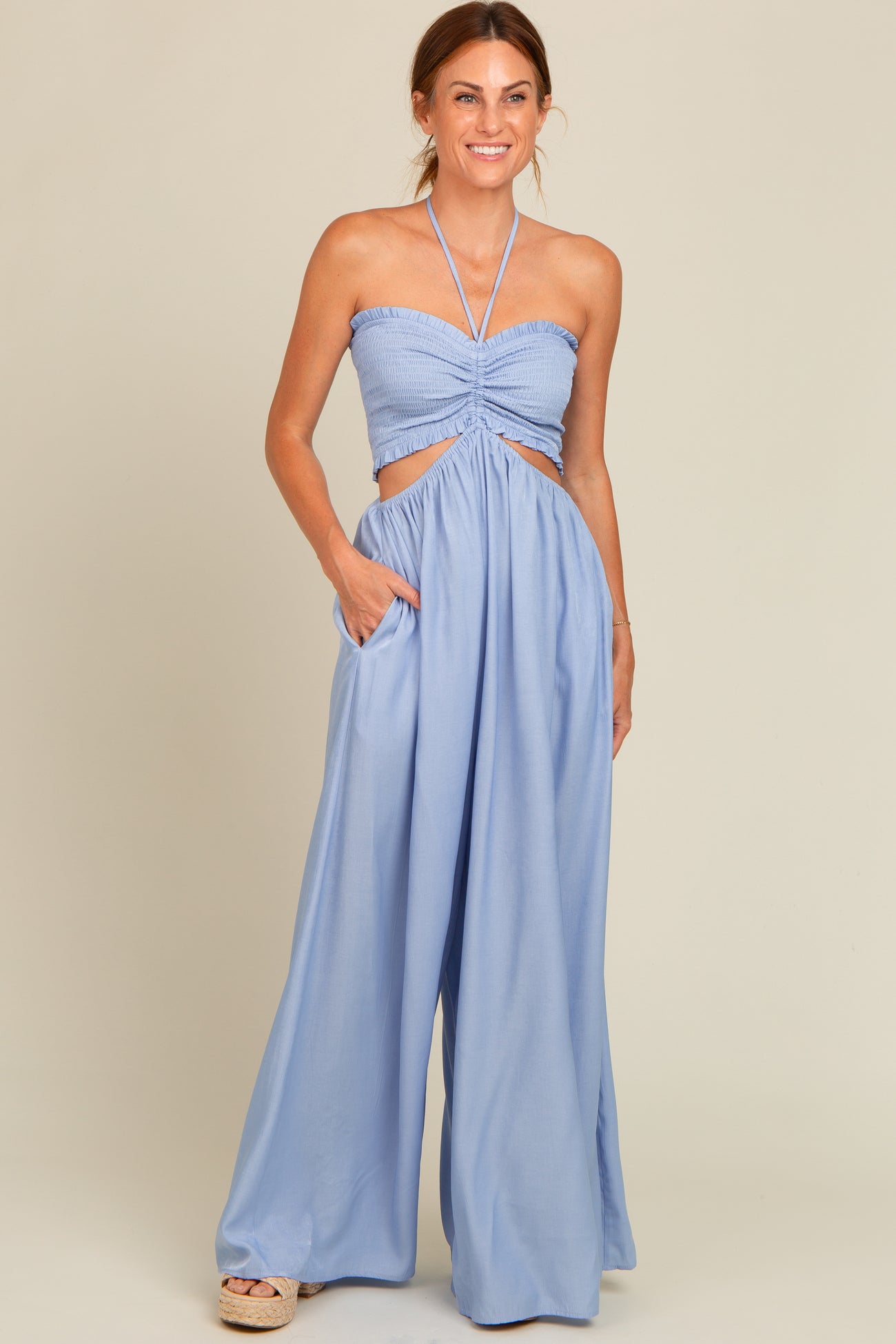 Light Blue Smocked Drawstring Halter Side Cutout Maternity Jumpsuit