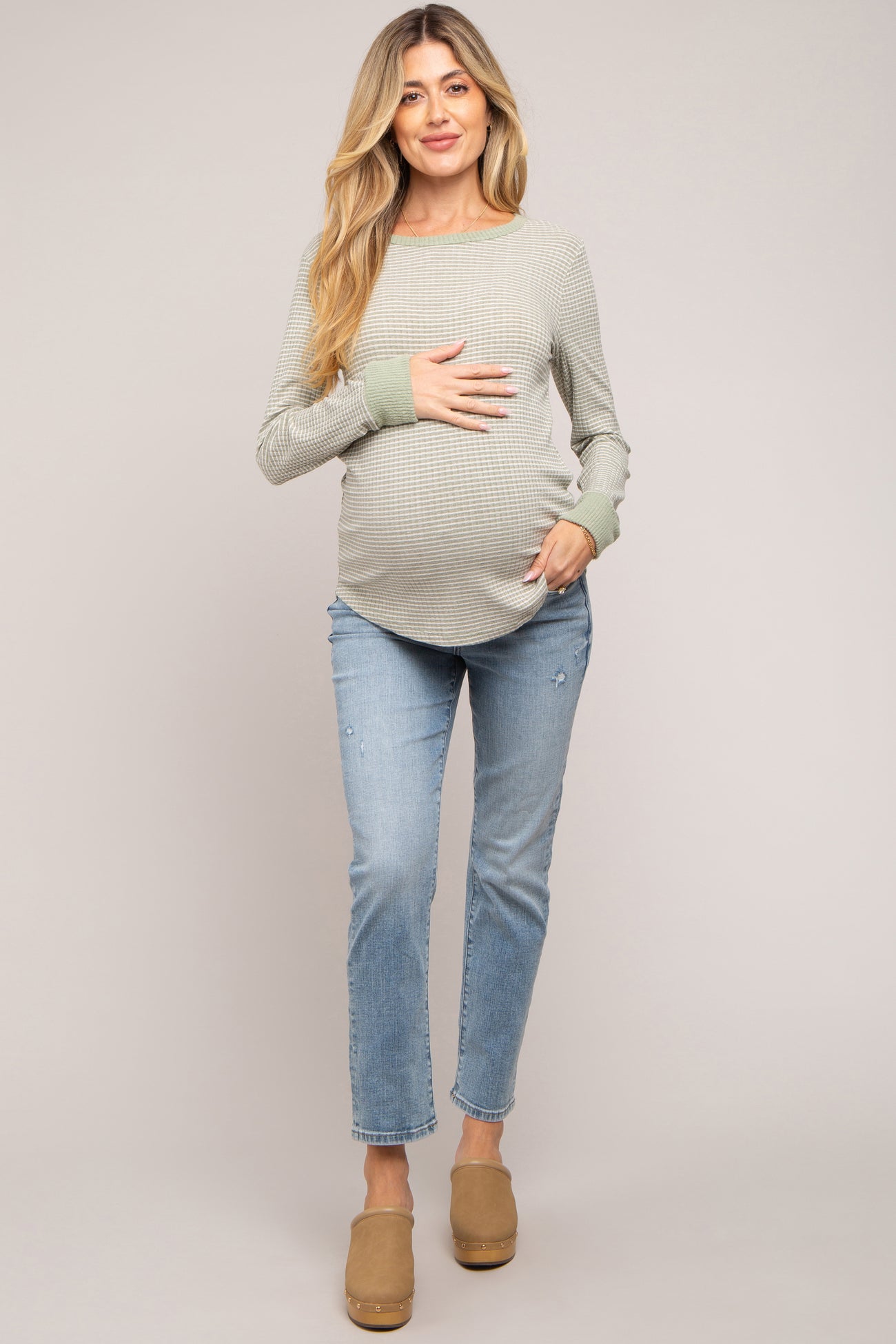 A pair of maternity jeans with straight legs, 5 pockets, small distressed accents at the front, and an elastic belly band