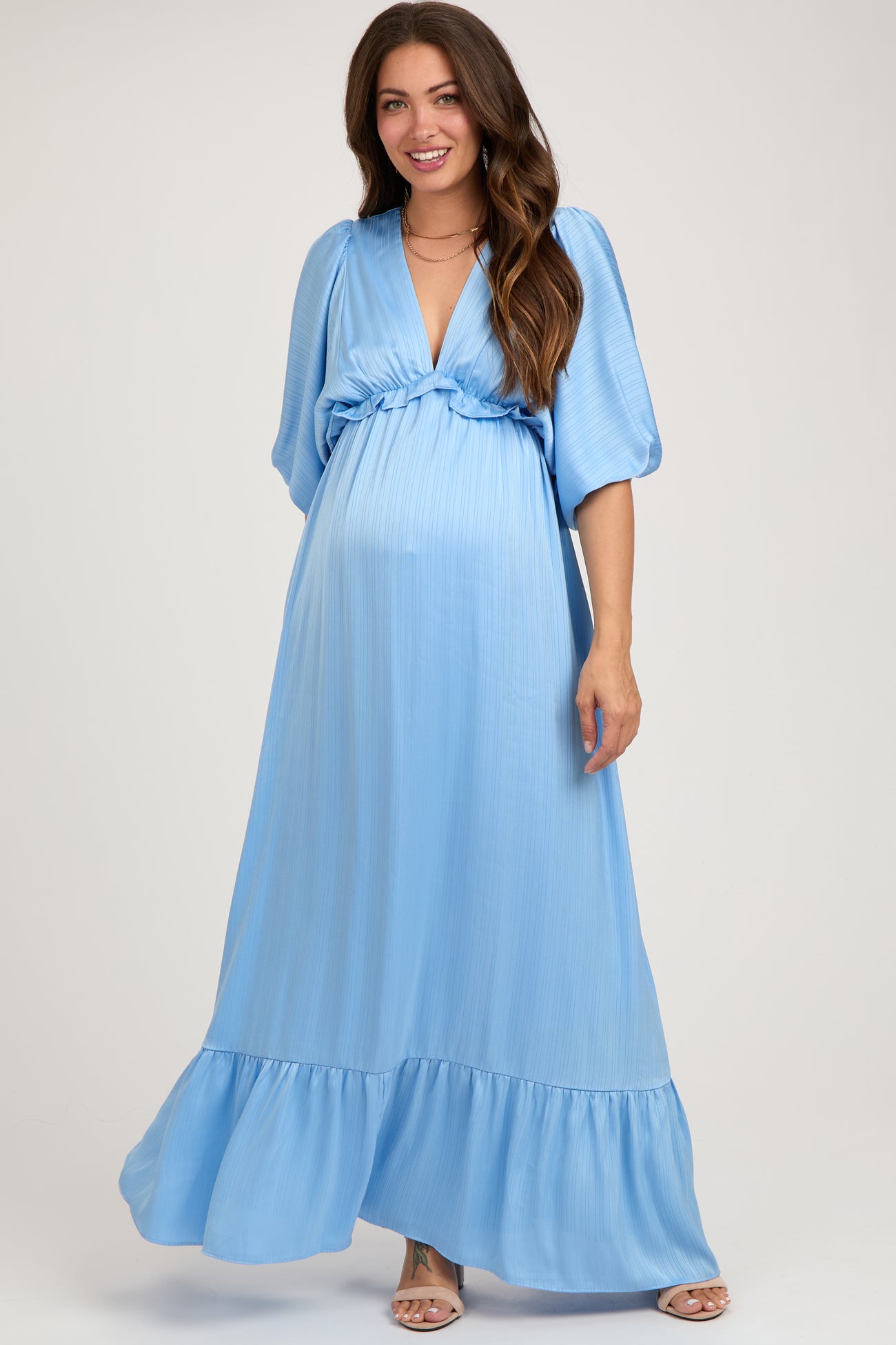 Light Blue Striped Ruffle Accent Maternity Maxi Dress