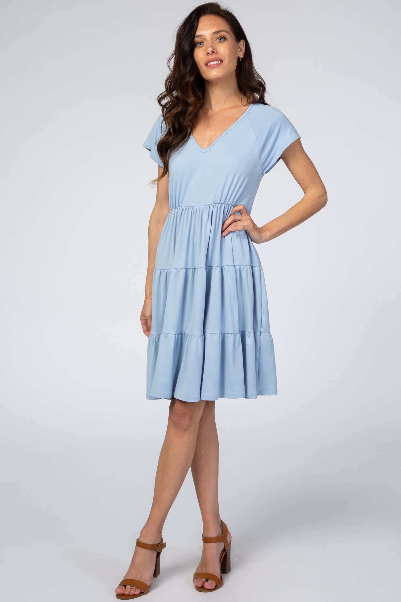 A solid hued tiered maternity dress featuring short sleeves and a v-neckline.