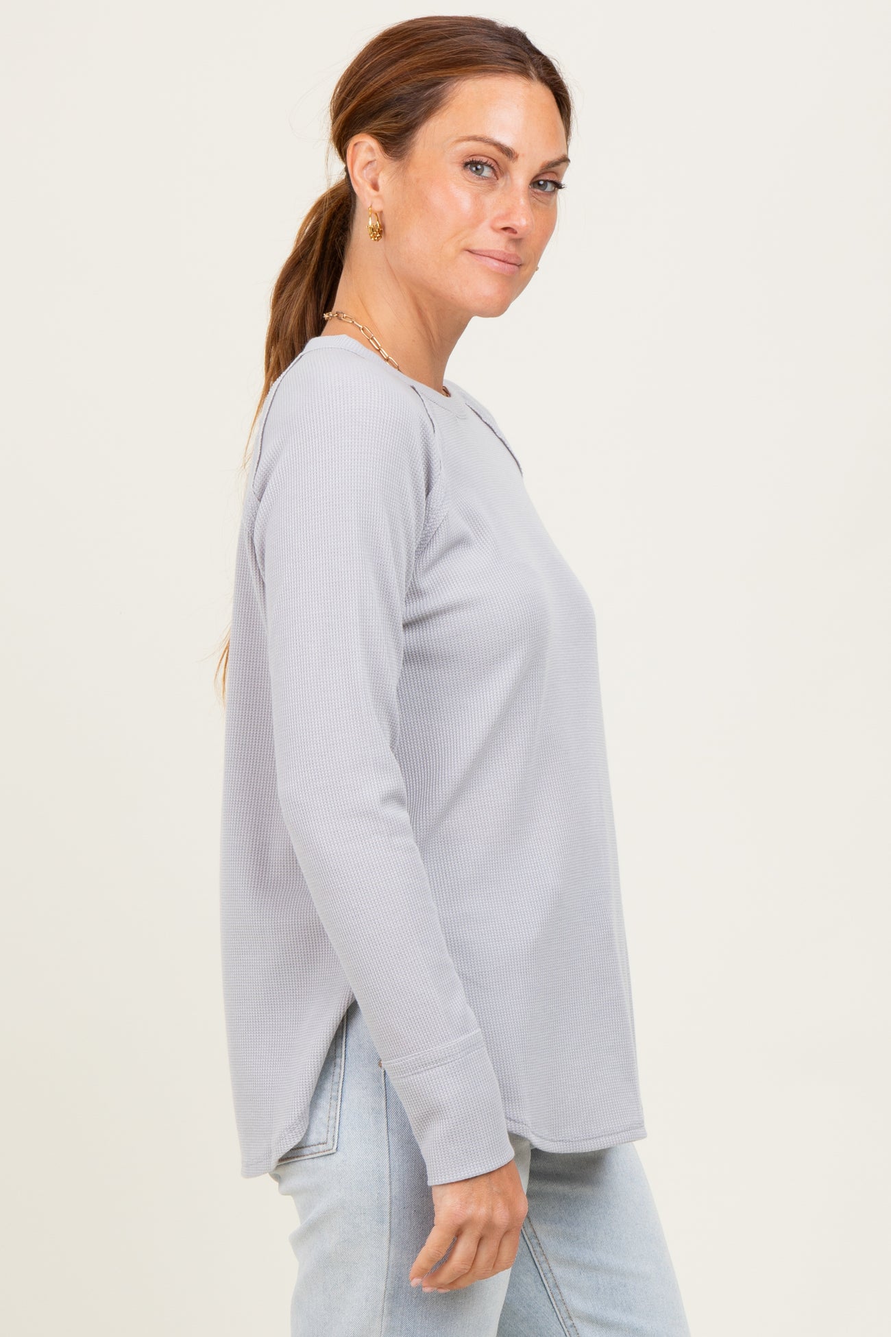 Meet your new go-to: the Light Grey Baby Waffle Knit Long Sleeve Top. Crafted from a soft, lightweight knit, this comfy top features a subtle waffle texture for added style. The relaxed fit makes it perfect for layering or wearing solo, while the versatile light grey hue pairs effortlessly with your favorite jeans, leggings, or skirts. Finished with classic crew neckline and long sleeves for cozy wear all season. Whether you’re lounging at home or headed out, this must-have top keeps your look casual yet chic. Easy to style, easy to love—add it to your closet today!